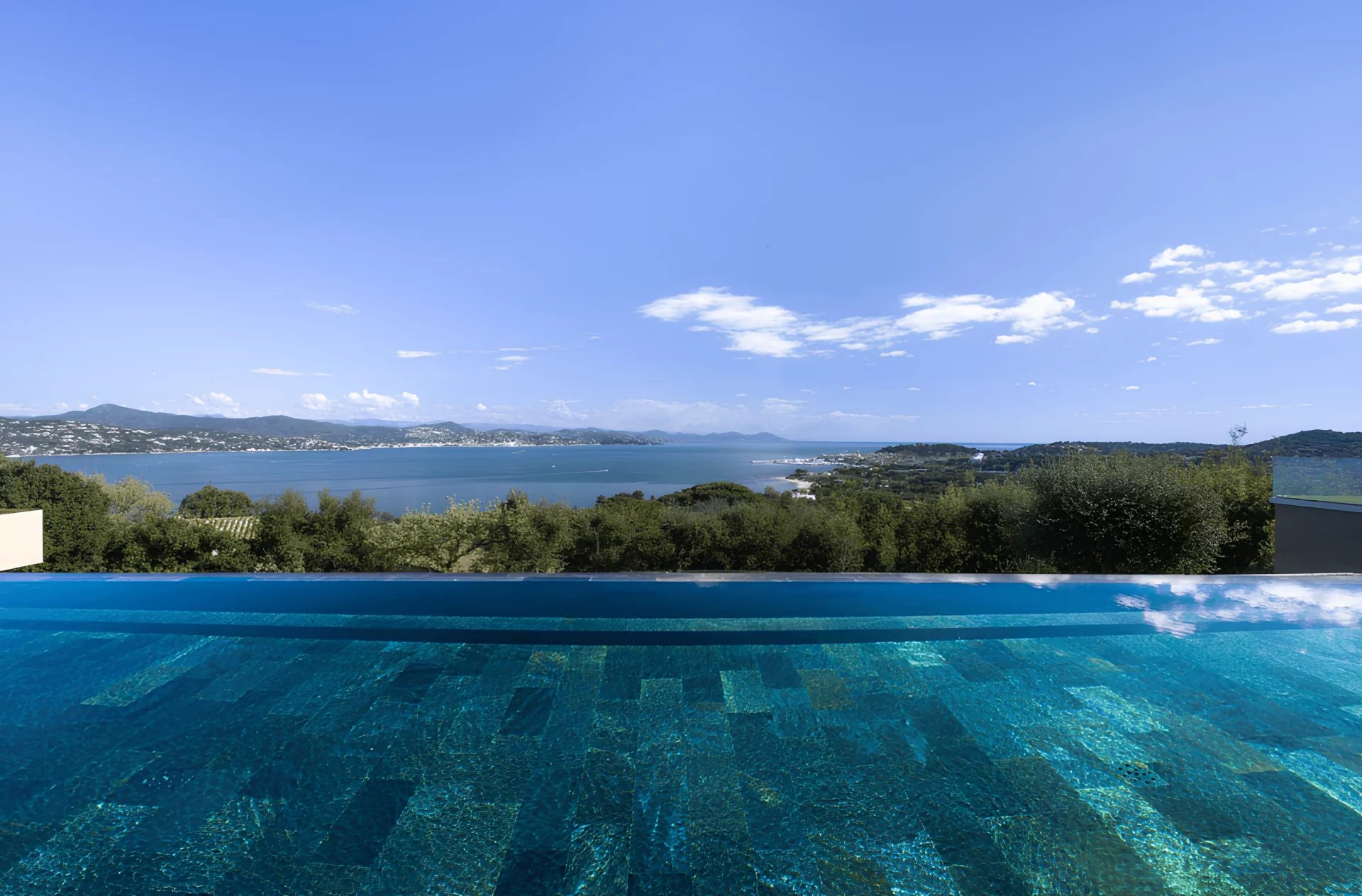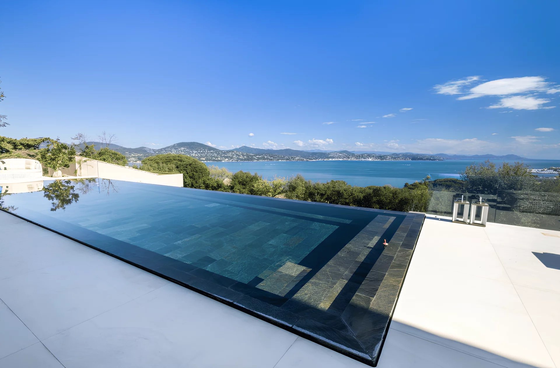 Im Außenbereich offenbart ein 2.500 m² großer Landschaftsgarten einen prachtvollen beheizten Infinity-Pool, ideal, um das ganze Jahr über die Sanftheit des tropéziennen Klimas zu genießen.