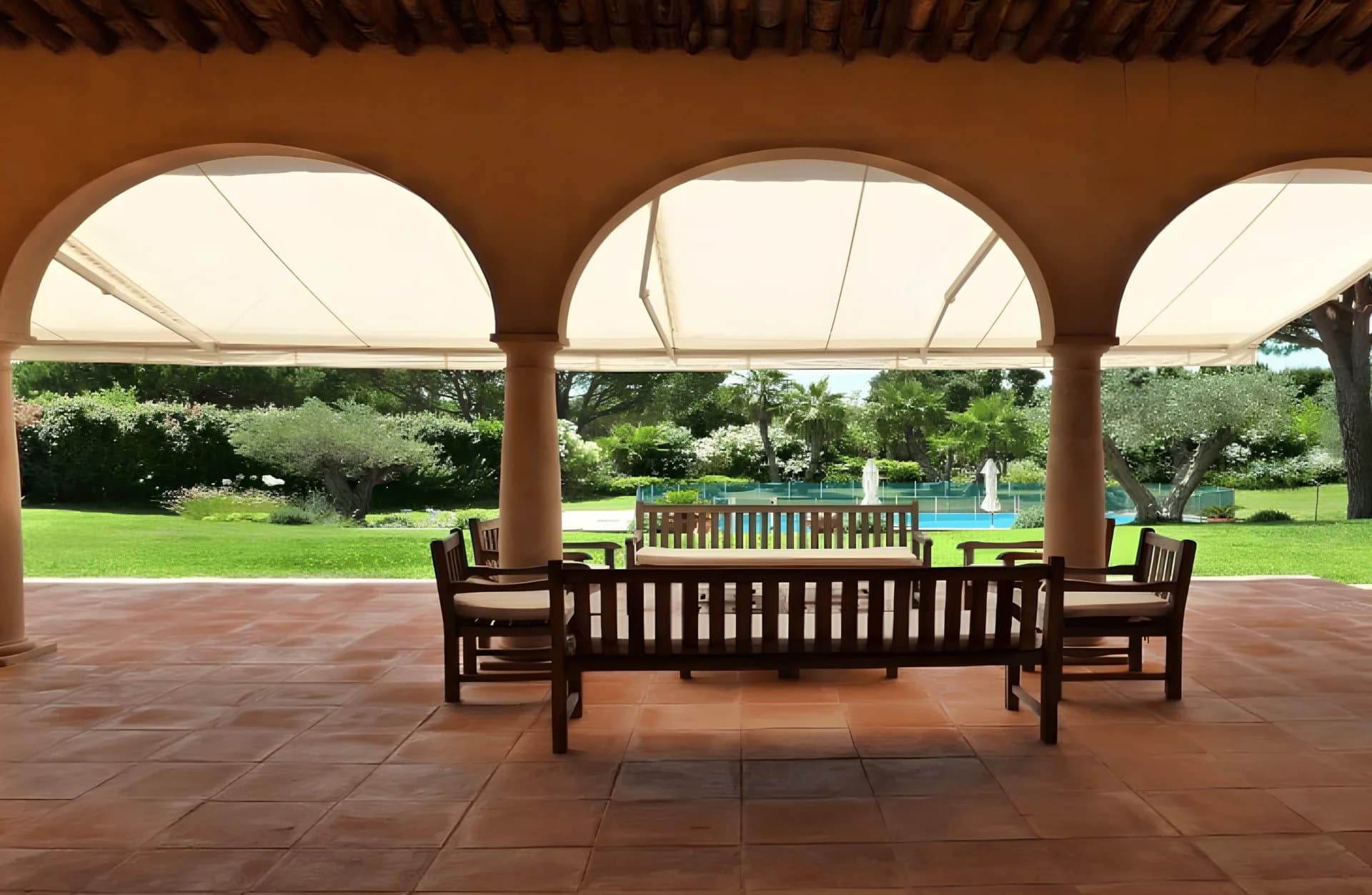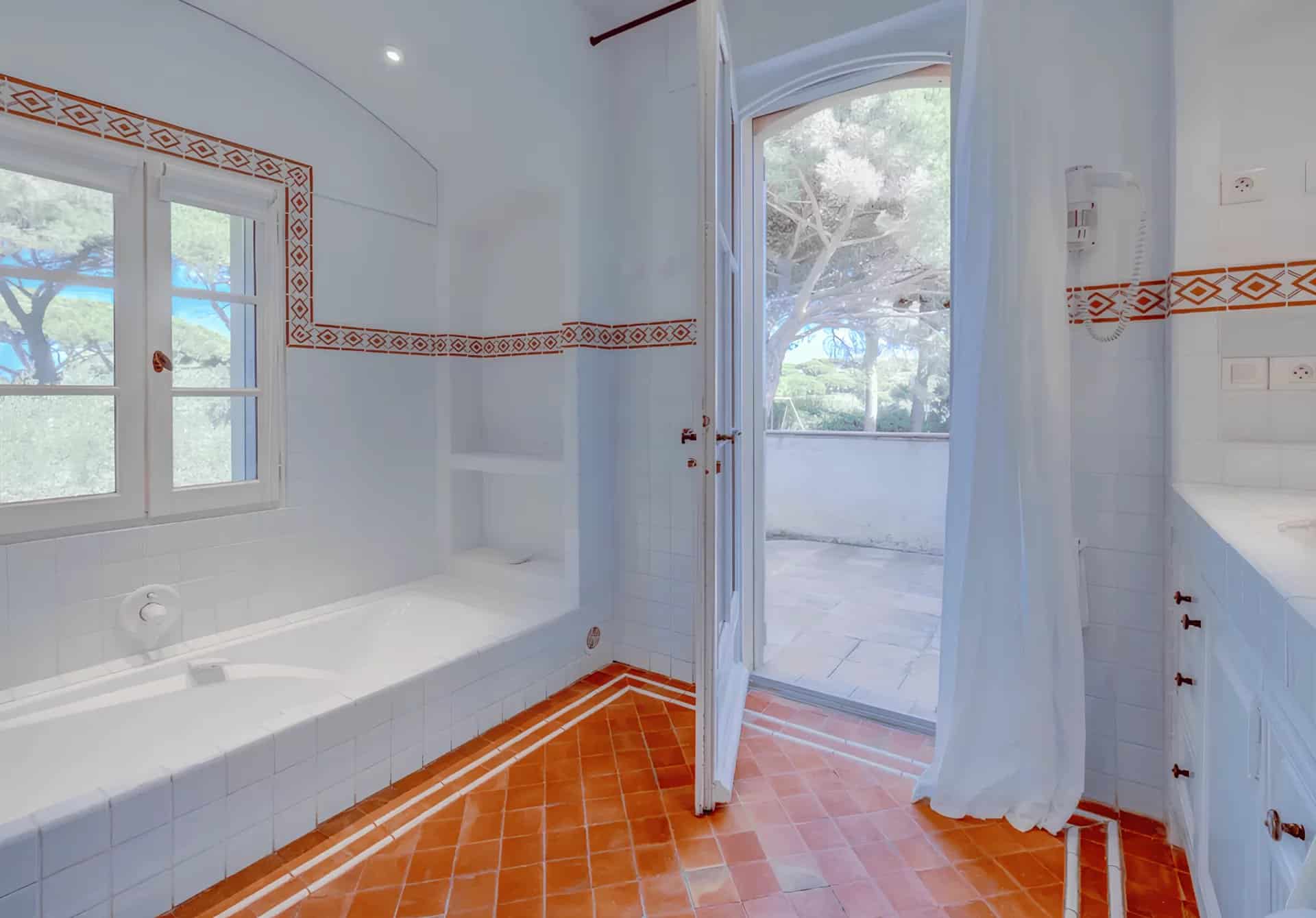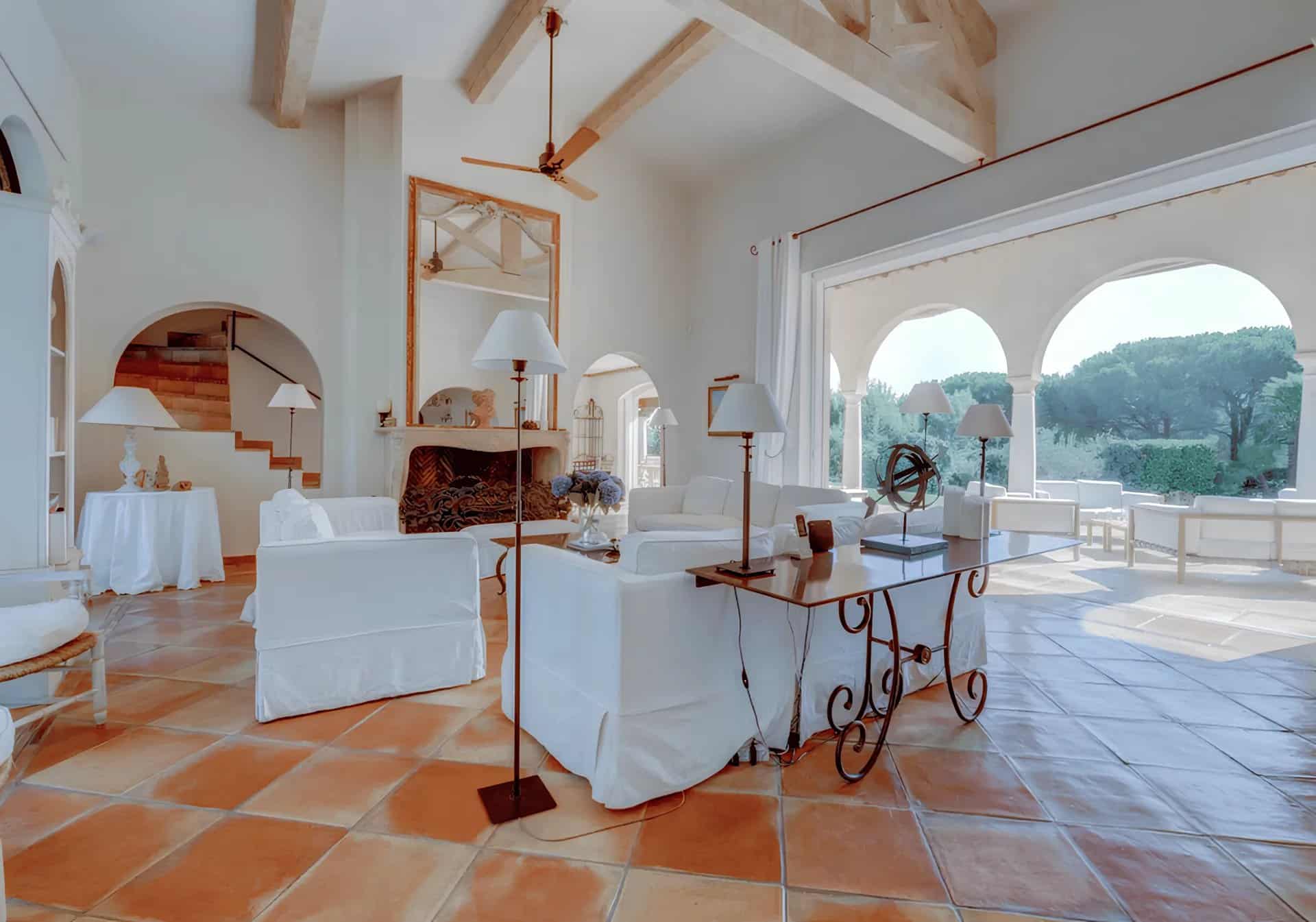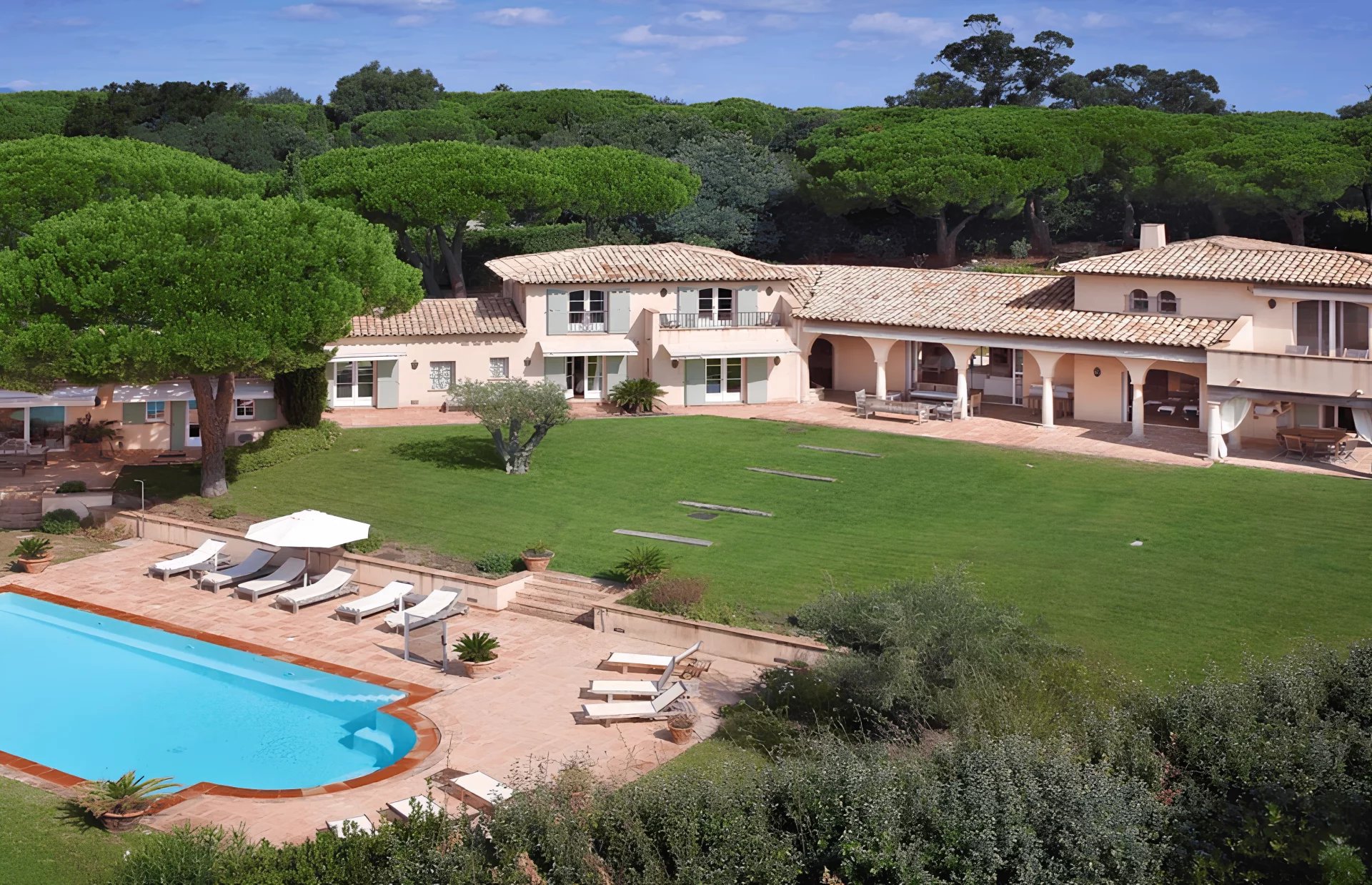 Das Haus und seine Nebengebäude umfassen 7 Schlafzimmer, darunter ein Hauptschlafzimmer mit einem Badezimmer und Duschraum sowie separaten WCs und zwei abgeschiedenen Terrassen mit leichtem Meerblick. Sechs weitere Schlafzimmer verfügen über zwei Badezimmer und vier Duschbäder, ein sehr helles Wohnzimmer von 65 m² mit Kathedraldecke, nord und südseitigen Durchgangsfenstern, die auf die Terrassen führen, sowie einem antiken Kamin. Ein Esszimmer, ein Fernsehzimmer mit WLAN und Innen und Außenbeschallung, eine voll ausgestattete amerikanische Küche, zwei Hauswirtschaftsräume, ein Sommerwohnzimmer und große Terrassen nach Norden und Süden ergänzen das Anwesen.