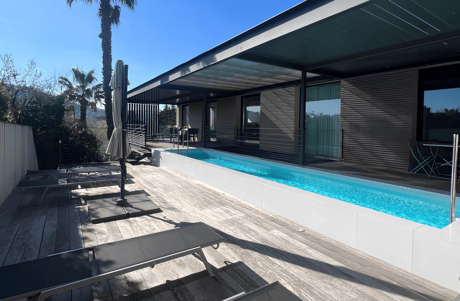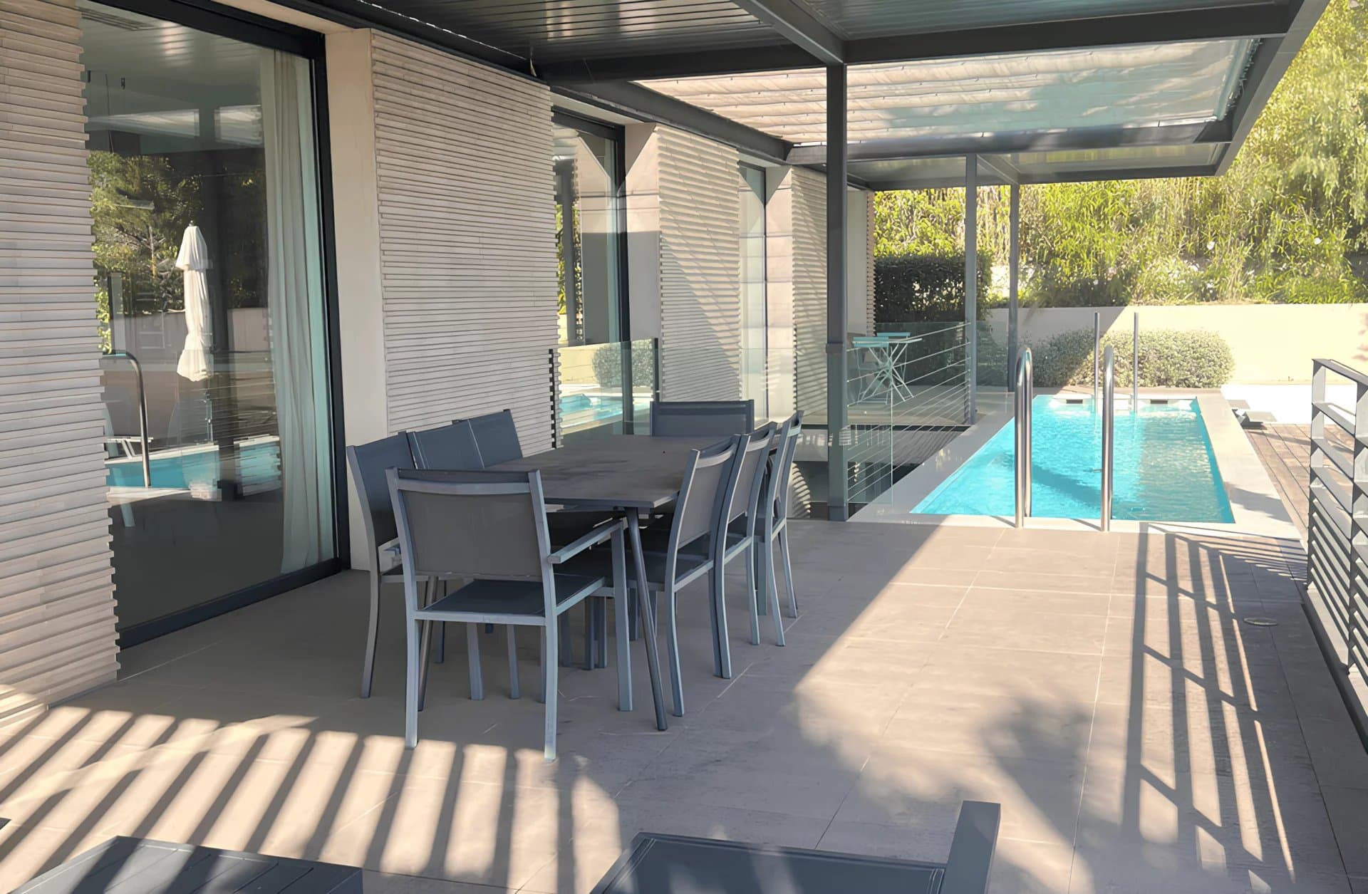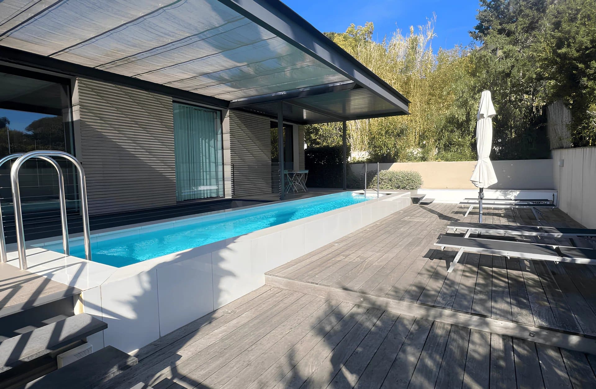 Located in a quiet area and a few minutes' walk from the village centre, contemporary villa in perfect condition, divided over 2 levels with a given surface area of approximately 220 m2 + an independent garage of approximately 45 m2, all built on a fenced and landscaped plot of 1,020 m2 with a parking area and large terraces, lap pool.