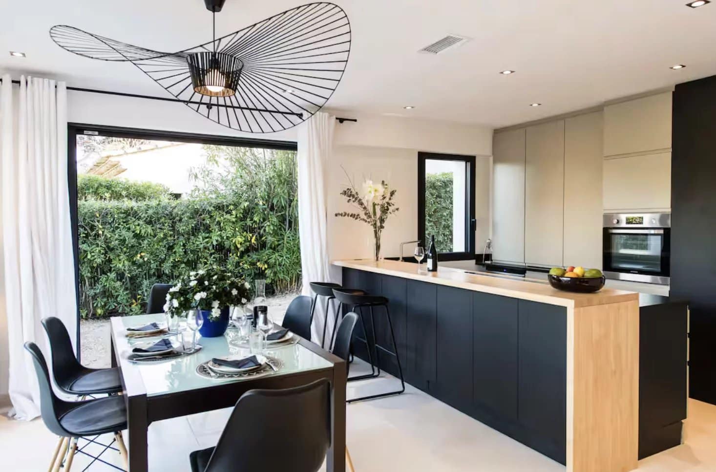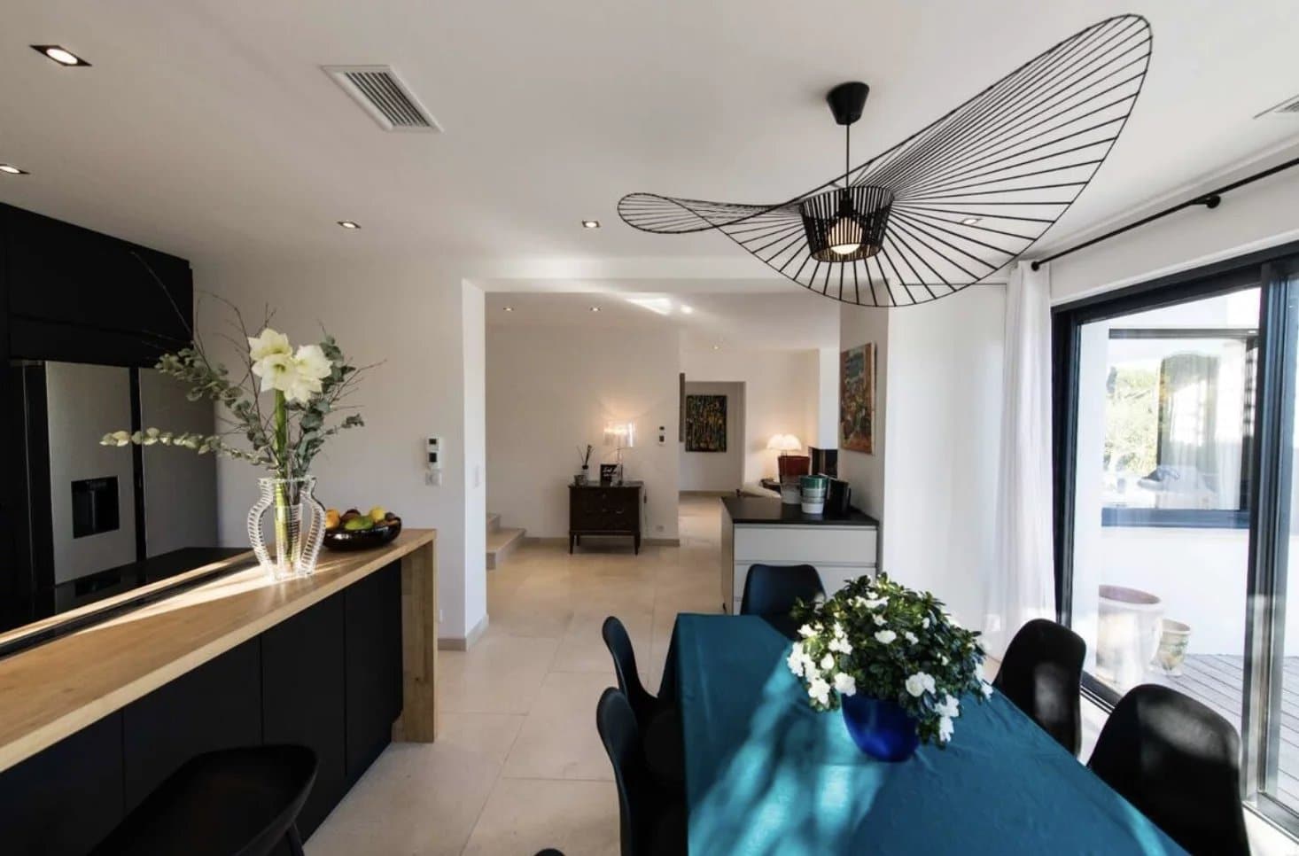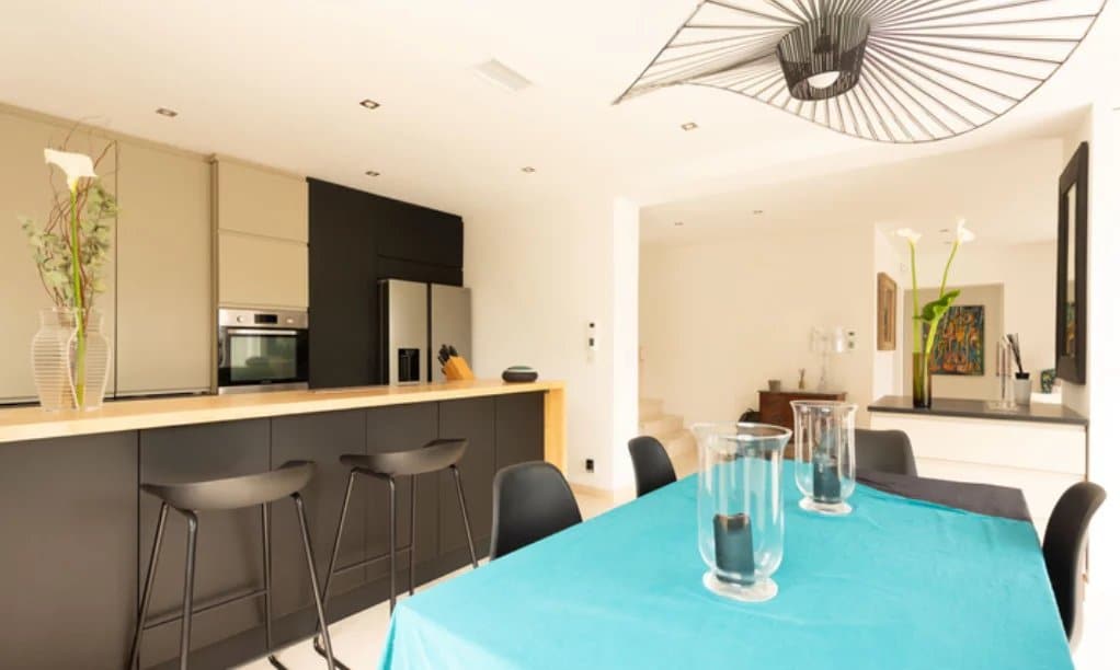 The kitchen is fully equipped with top-of-the-range amenities including two refrigerators, one of them American-style, two dishwashers, a wine cellar, a Nespresso machine, and generous storage. The villa also includes a laundry room, full air conditioning, an alarm system, electric shutters, Wi-Fi, and four televisions.