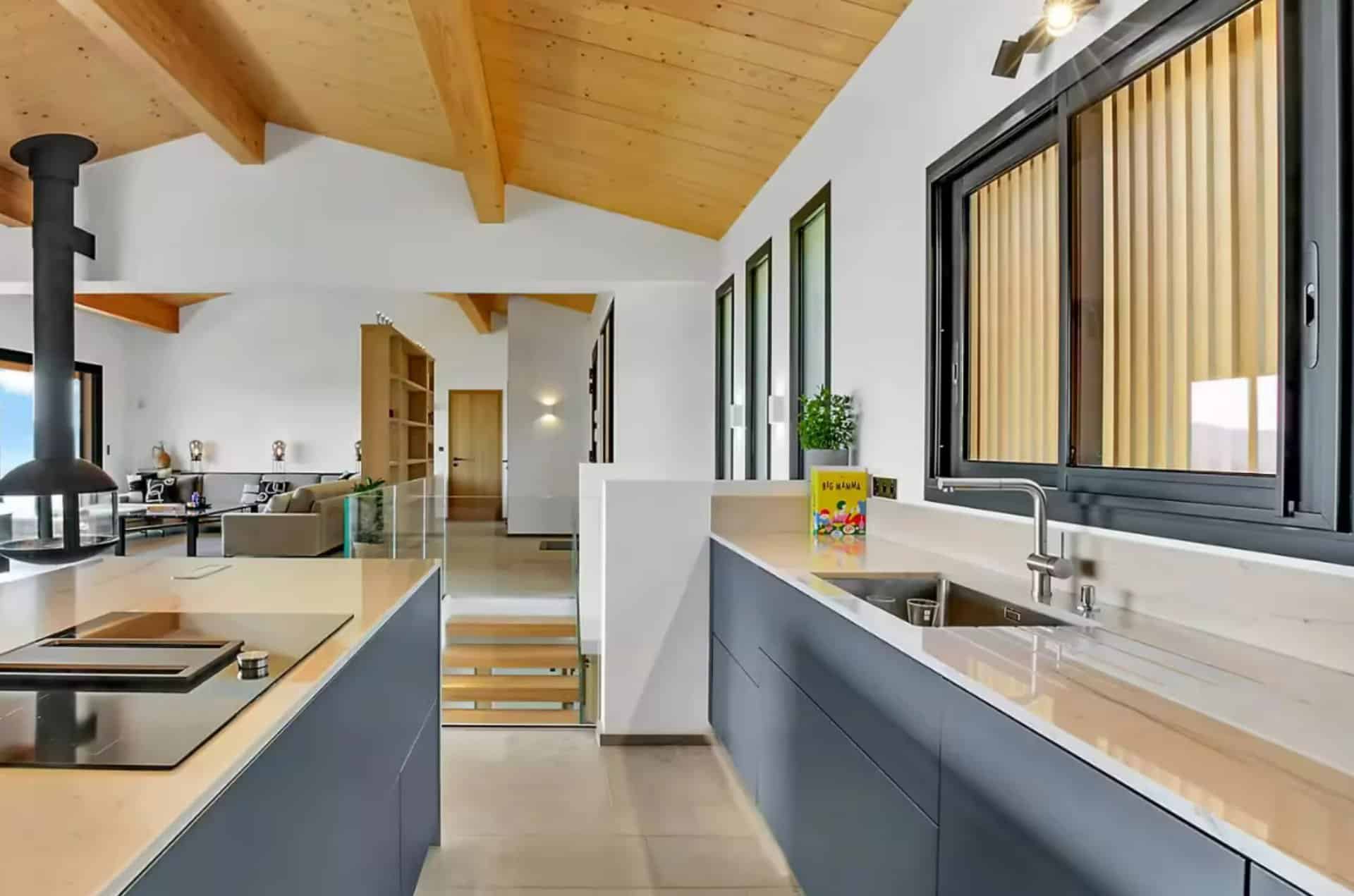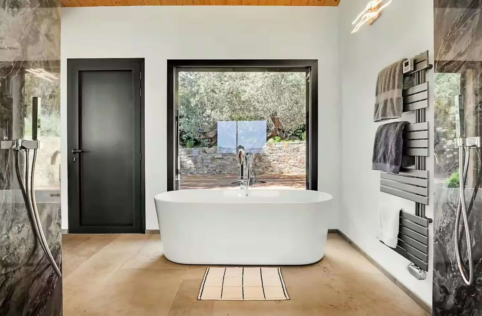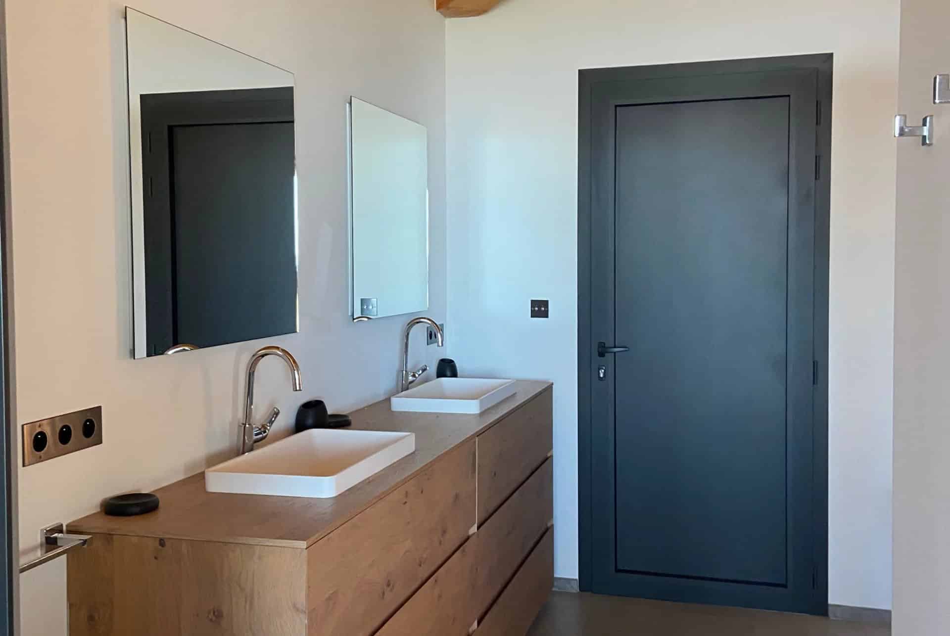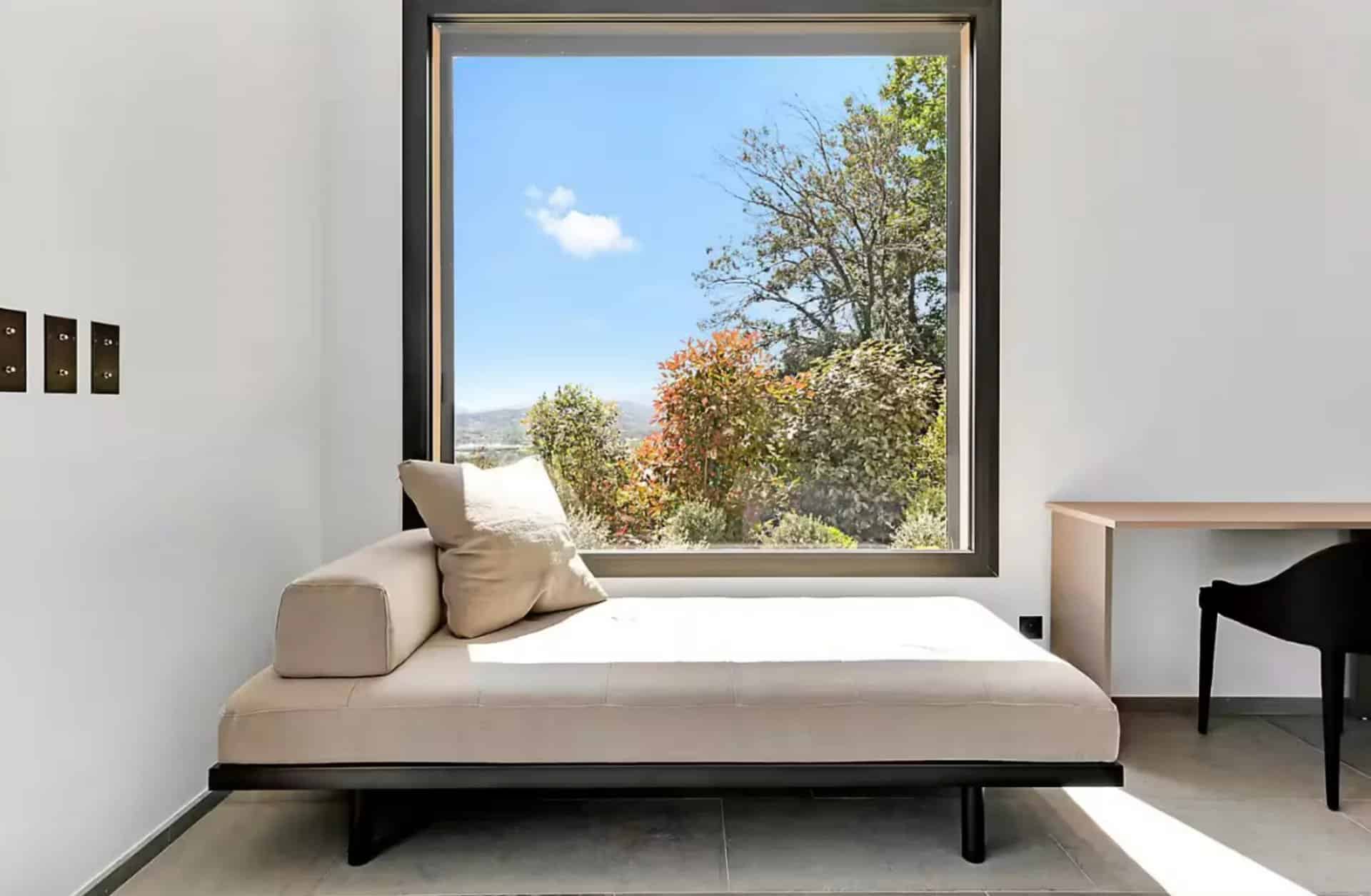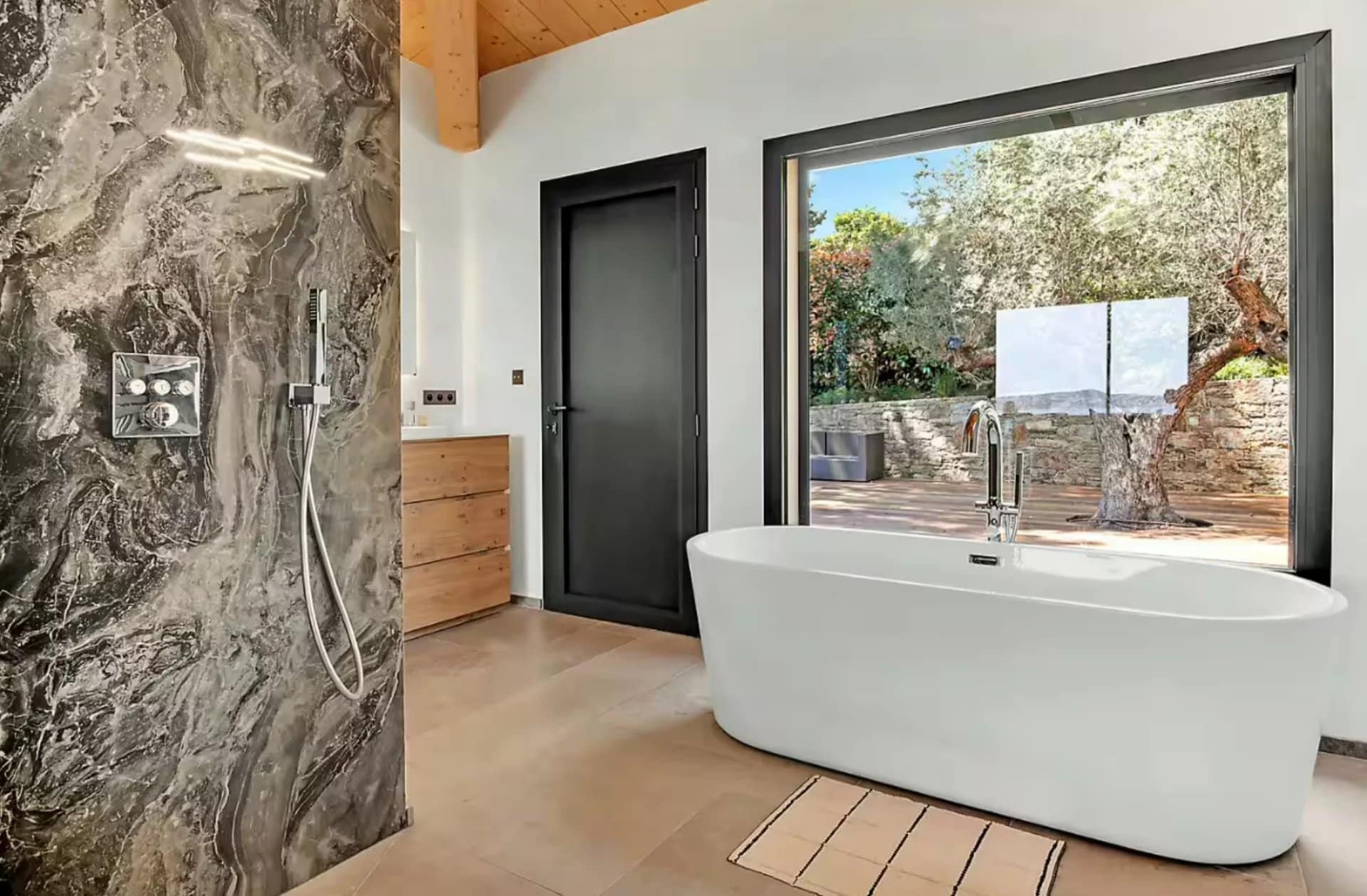 Boasting an extraordinary 180° sea view from its two floors, the villa is south-west facing and surrounded by protected natural zones, ensuring privacy and tranquility. Its modern architecture, crafted by exceptional artisans, blends seamlessly with a lush Mediterranean landscape adorned with lemon trees, orange trees, and olive trees.