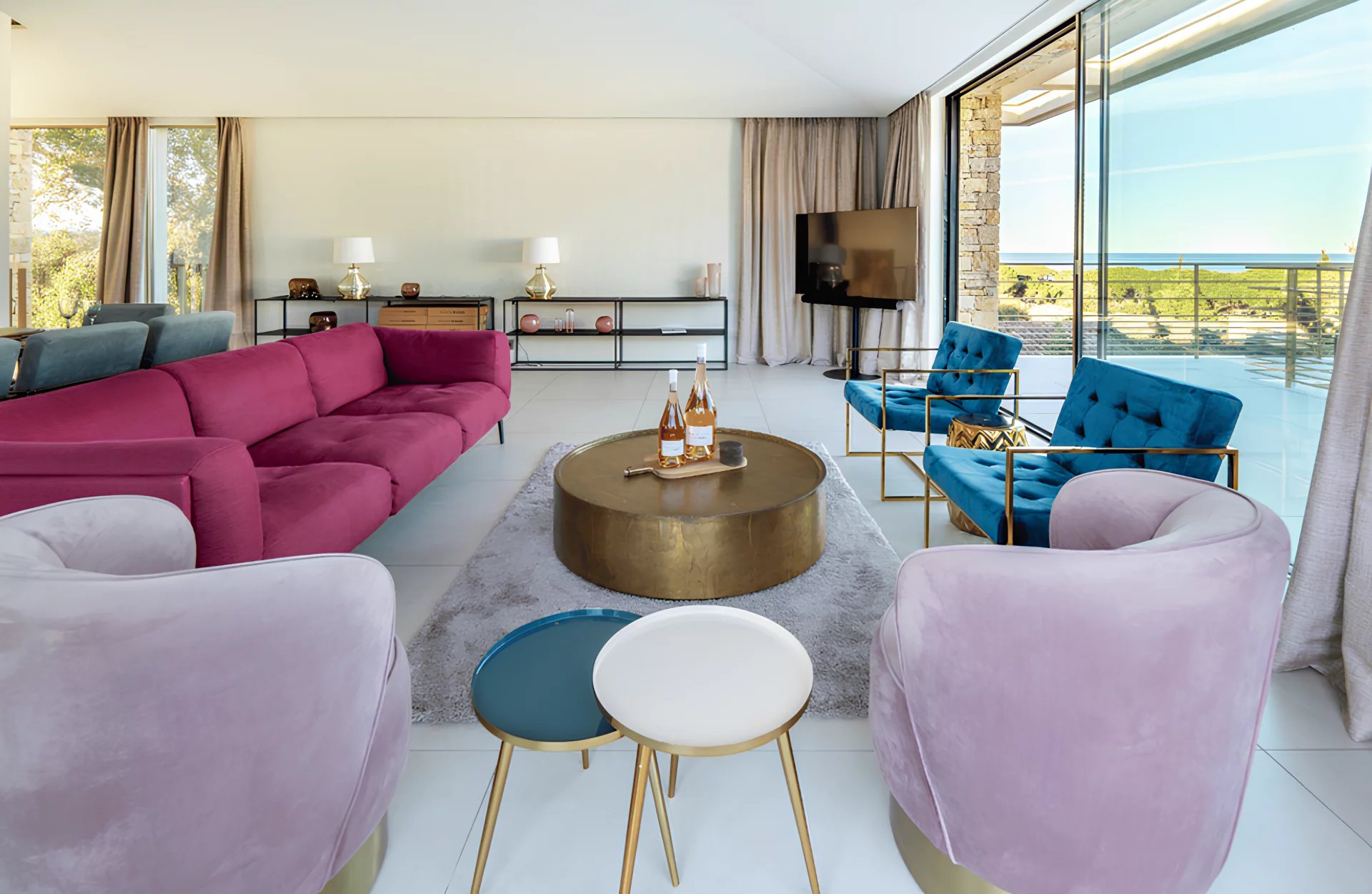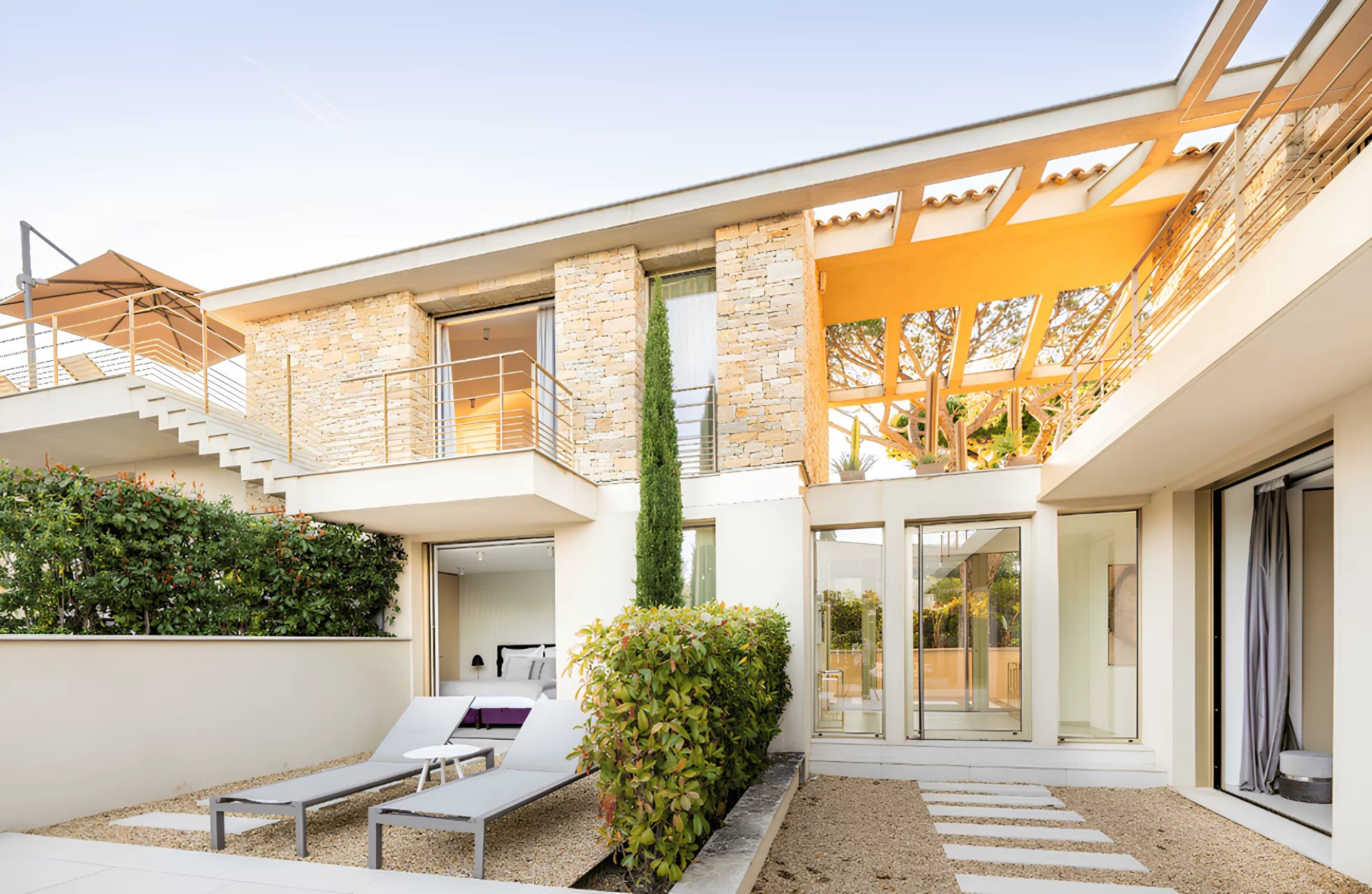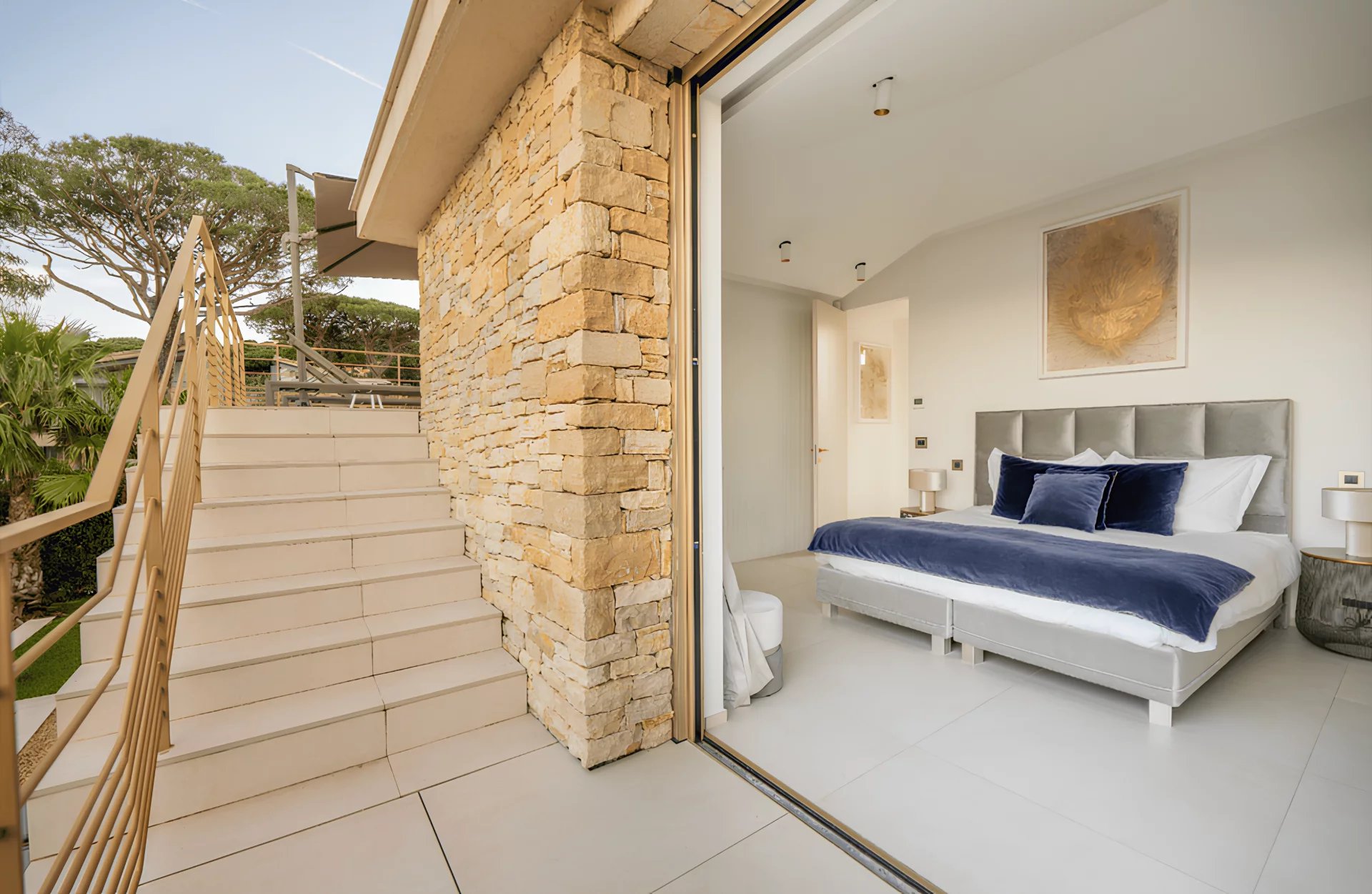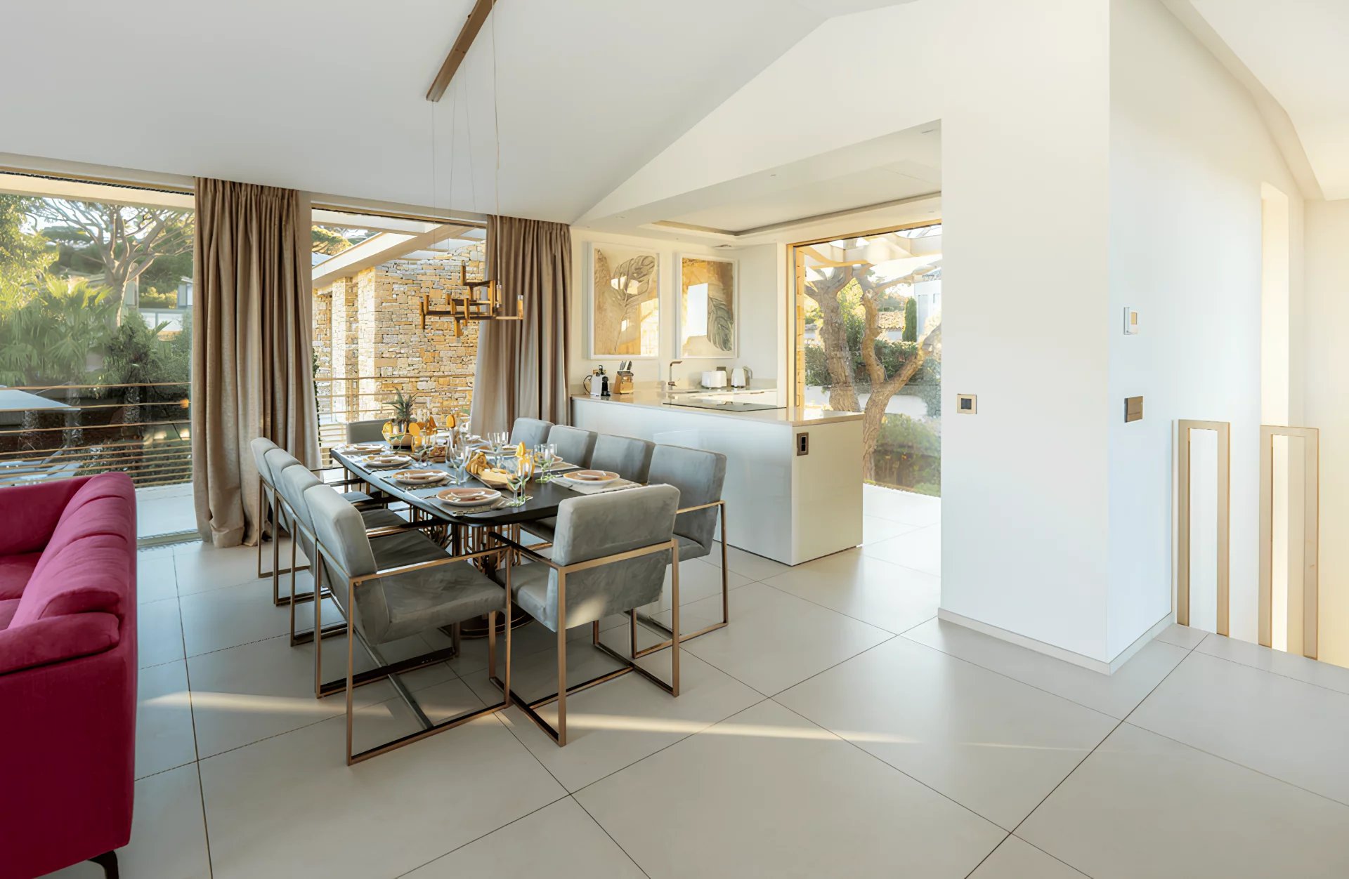 The villa Sous le Soleil was built in 2021 in a secure residential park next to the famous Plage "Les Salins" in Saint-Tropez. It stands out for its chic and glamorous style with gold-colored finishes and a beautiful white wall mosaic with rainbow reflexions. It offers sunny terraces, a magnificient sea view and a beautiful garden with heated Pool.
