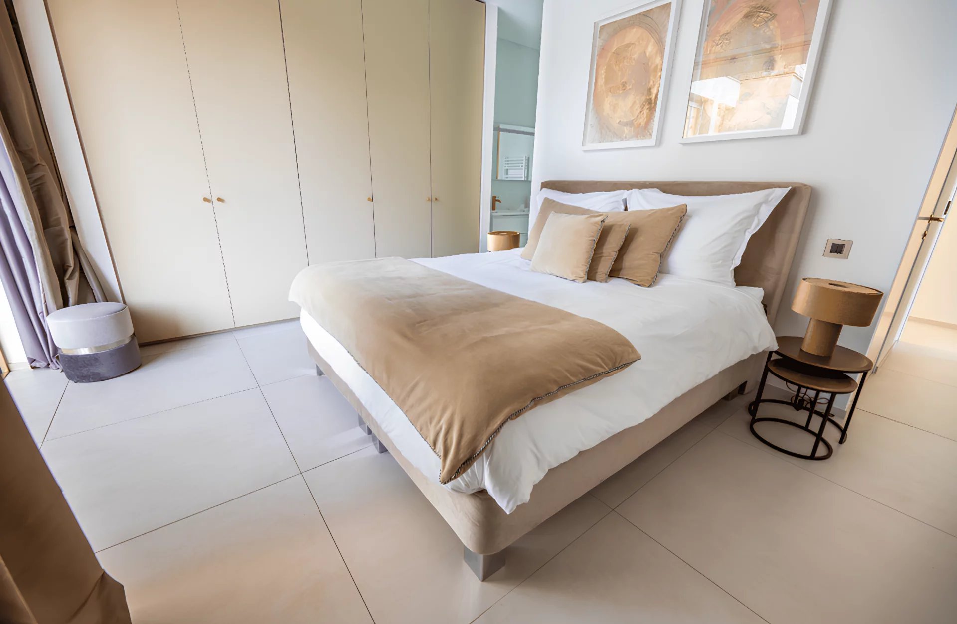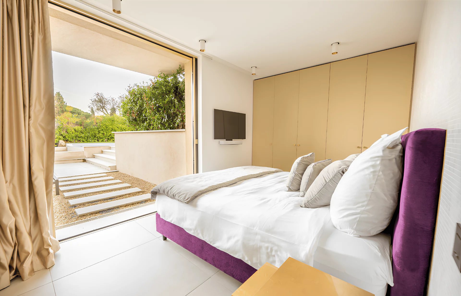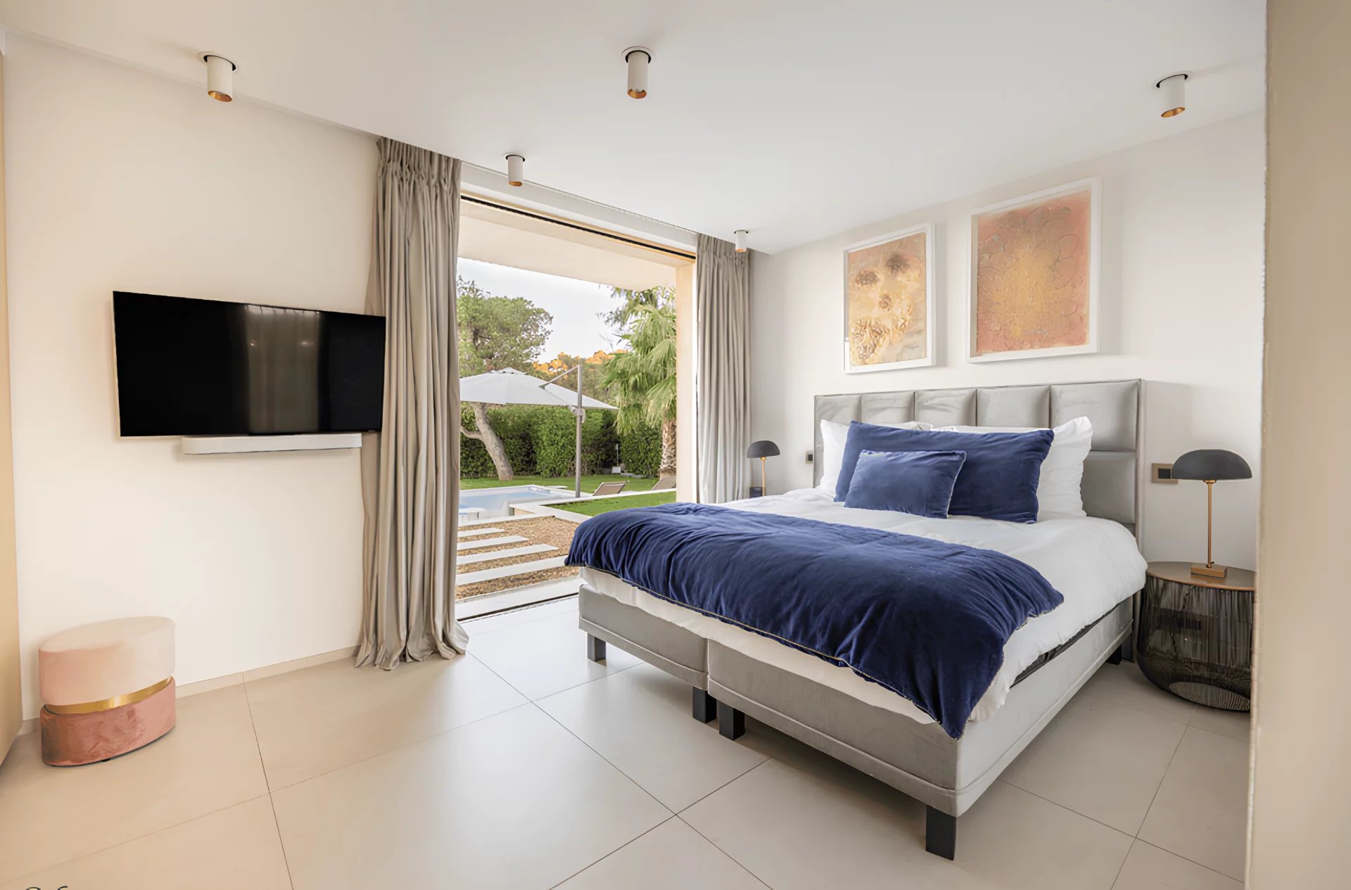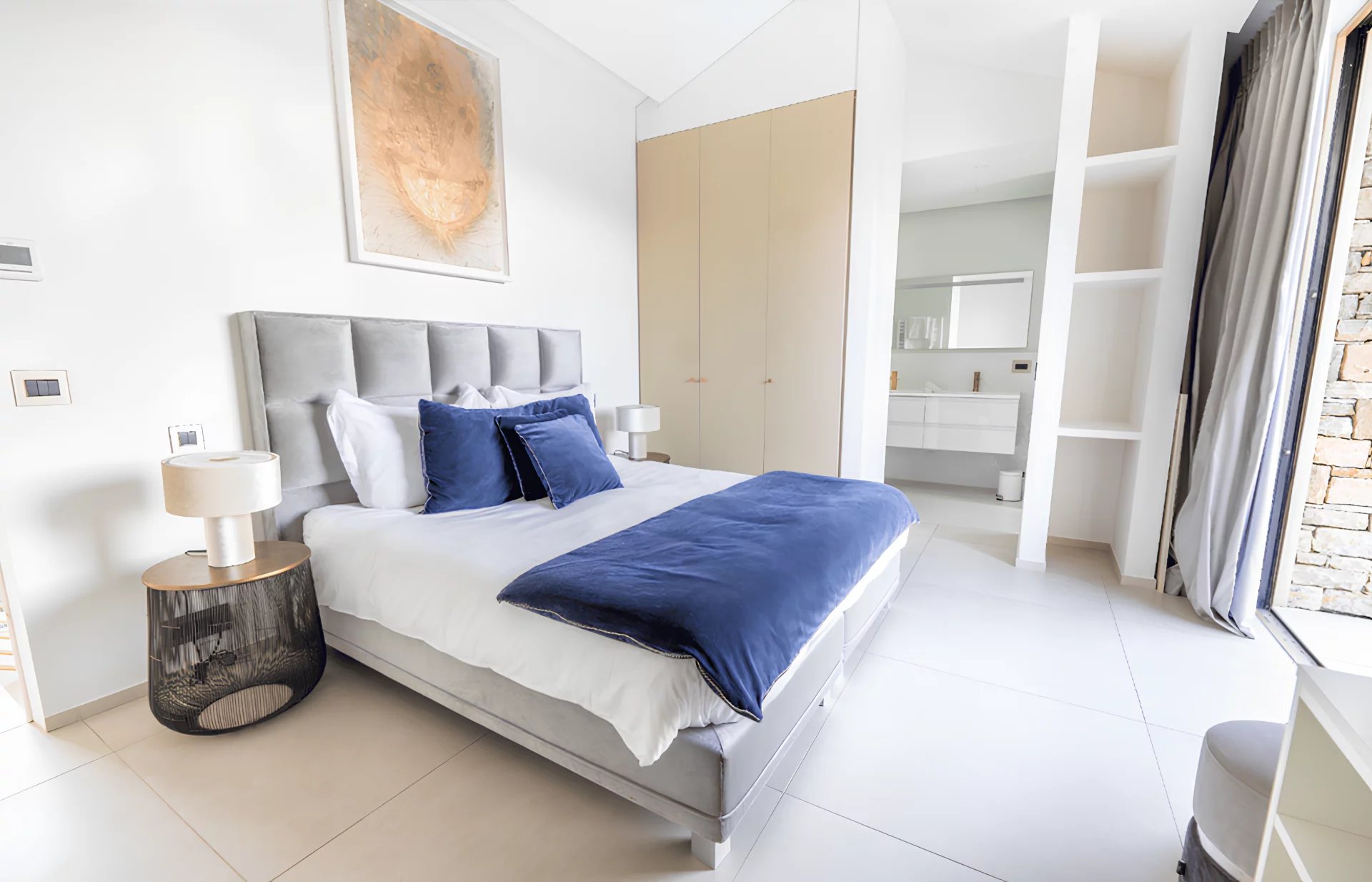 The villa Sous le Soleil was built in 2021 in a secure residential park next to the famous Plage "Les Salins" in Saint-Tropez. It stands out for its chic and glamorous style with gold-colored finishes and a beautiful white wall mosaic with rainbow reflexions. It offers sunny terraces, a magnificient sea view and a beautiful garden with heated Pool.