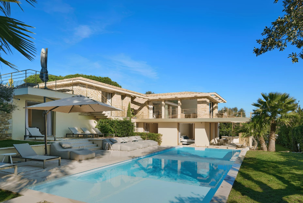 The fifth bedroom is located upstairs and has a secure individual entrance, an en-suite bathroom and a terrace with sea view. On the other side, also upstairs, is the living room with sofa, dining table for 10 and open fitted kitchen which opens directly onto a terrace with sea view and outdoor dining area for 10. An outside staircase provides access to the garden and the terrace with deckchairs and the swimming pool located on the lower level.