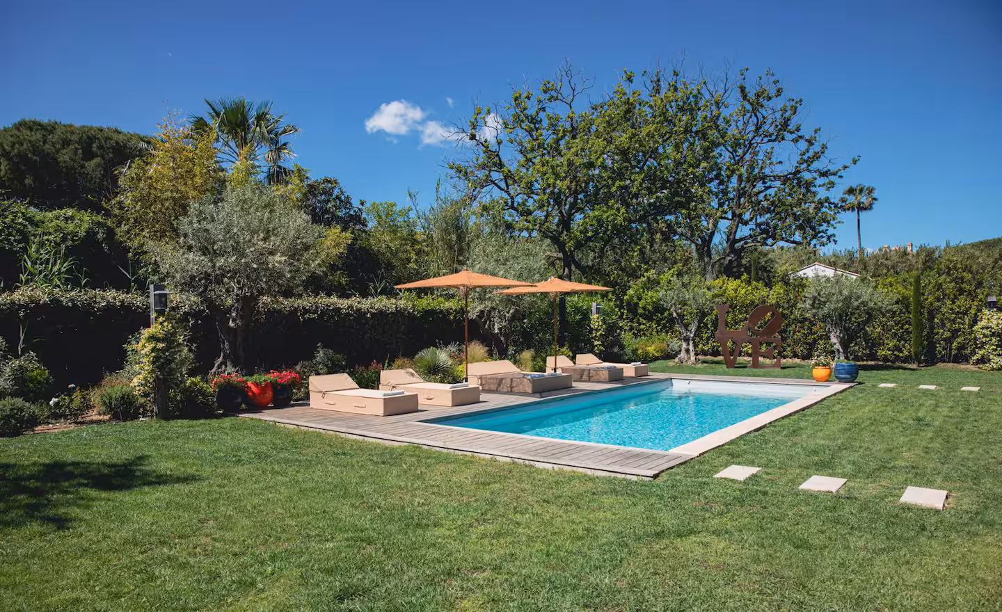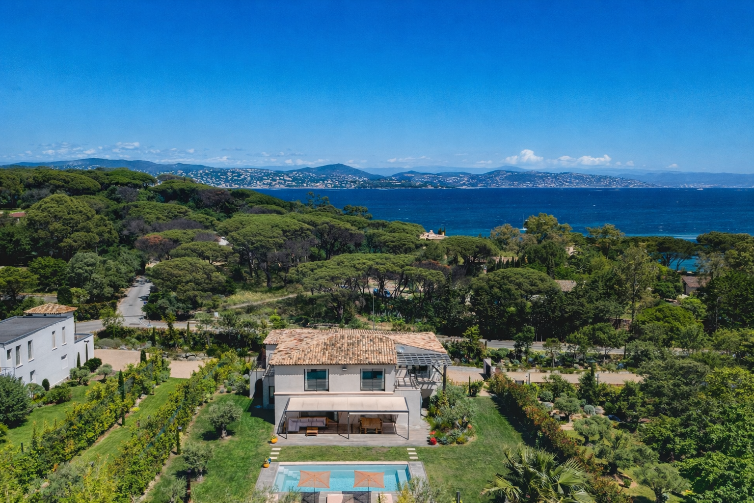 Cette villa moderne et élégante de 240 m² avec une piscine et un jardin paysager de 1330 m² est idéalement située à seulement 900 mètres de la plage des Canebiers et à 15 minutes à pied du port et de la Place des Lices.