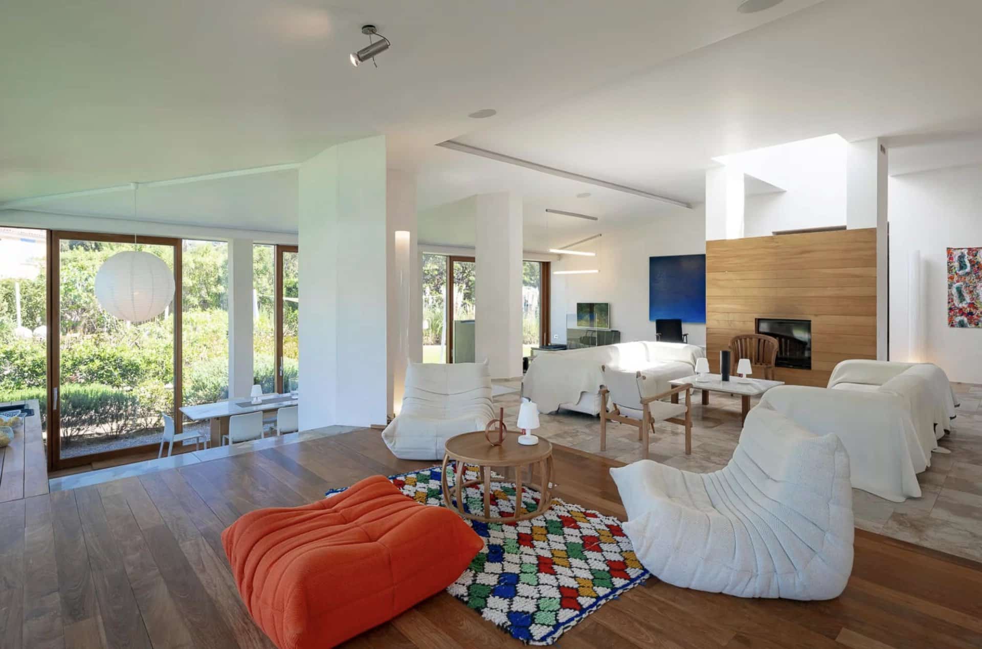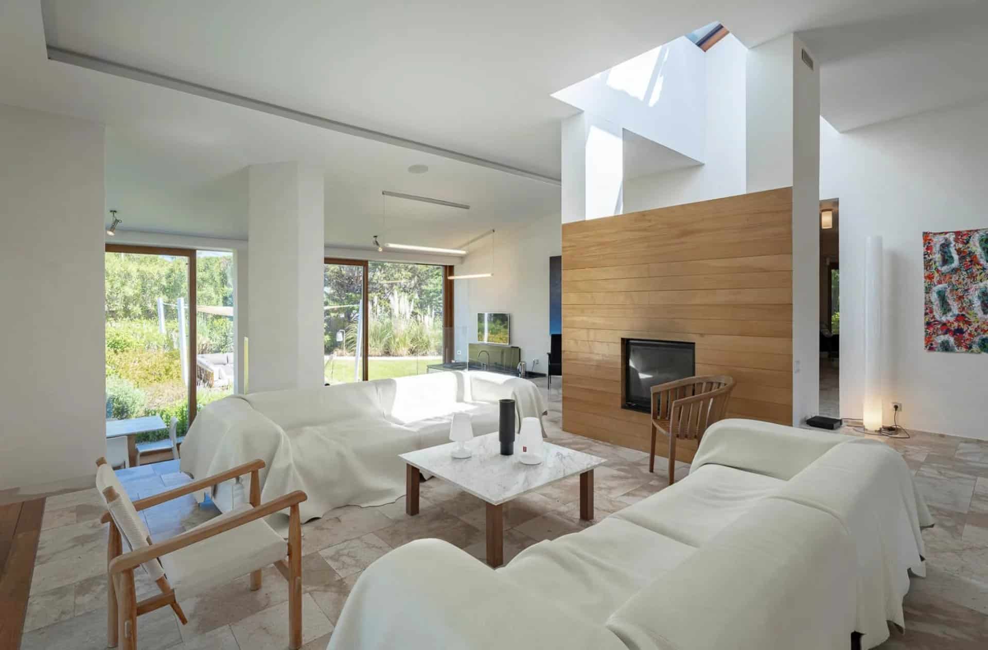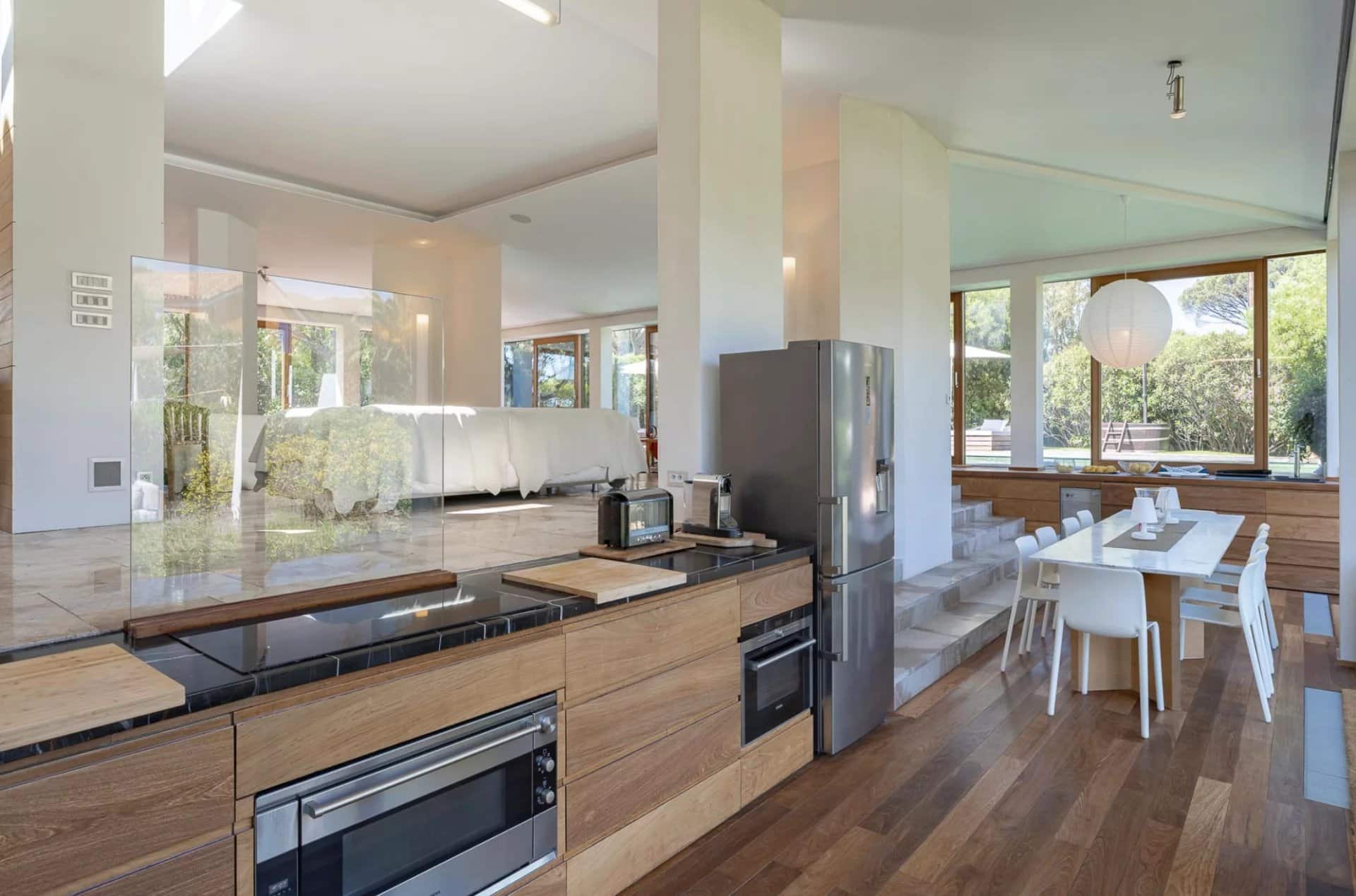 Le salon est incroyable, 180 m2 de plain-pieds, entouré de larges baies vitrées en bois donnant sur le jardin et qui permet de vivre dans plusieurs espaces : un coin salon avec cheminée, un autre salon avec une télévision à grand écran plat, une salle à manger avec une grande table en bois et une vaste cuisine qui donne sur le jardin comprenant une longue table en marbre idéale pour prendre les repas tous ensembles.