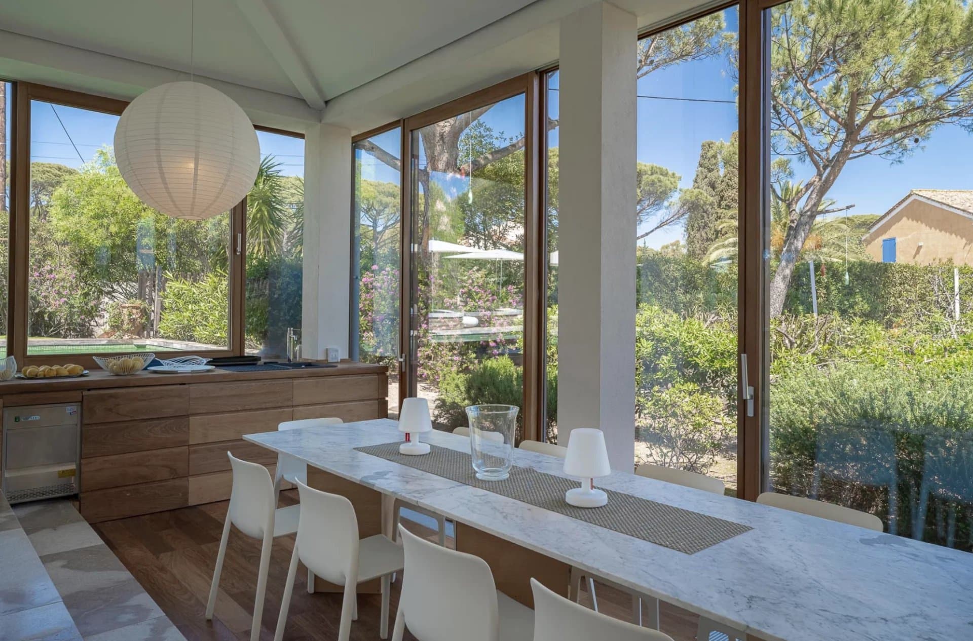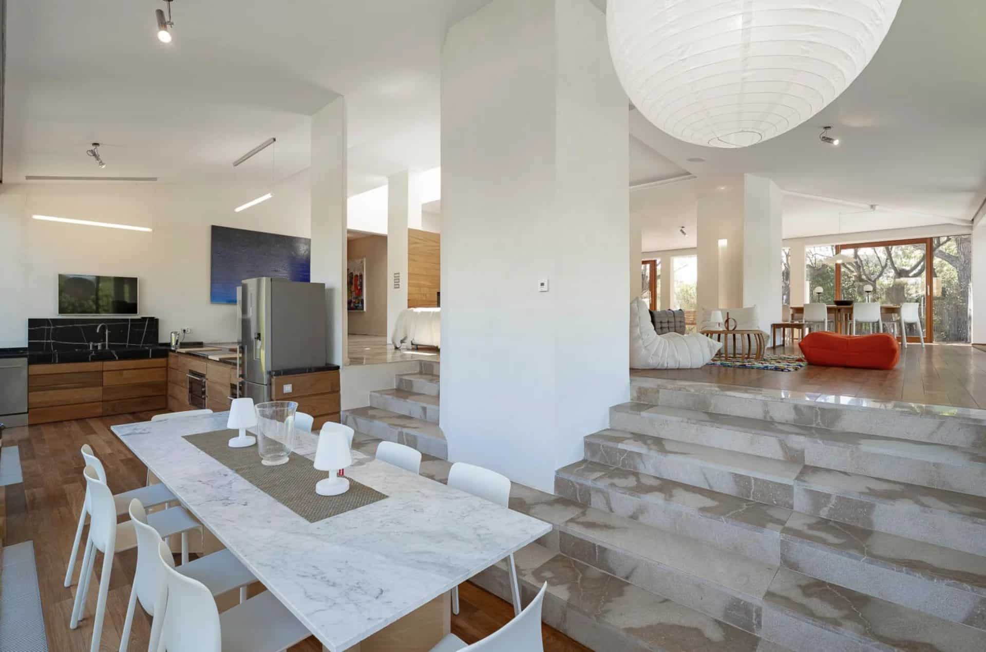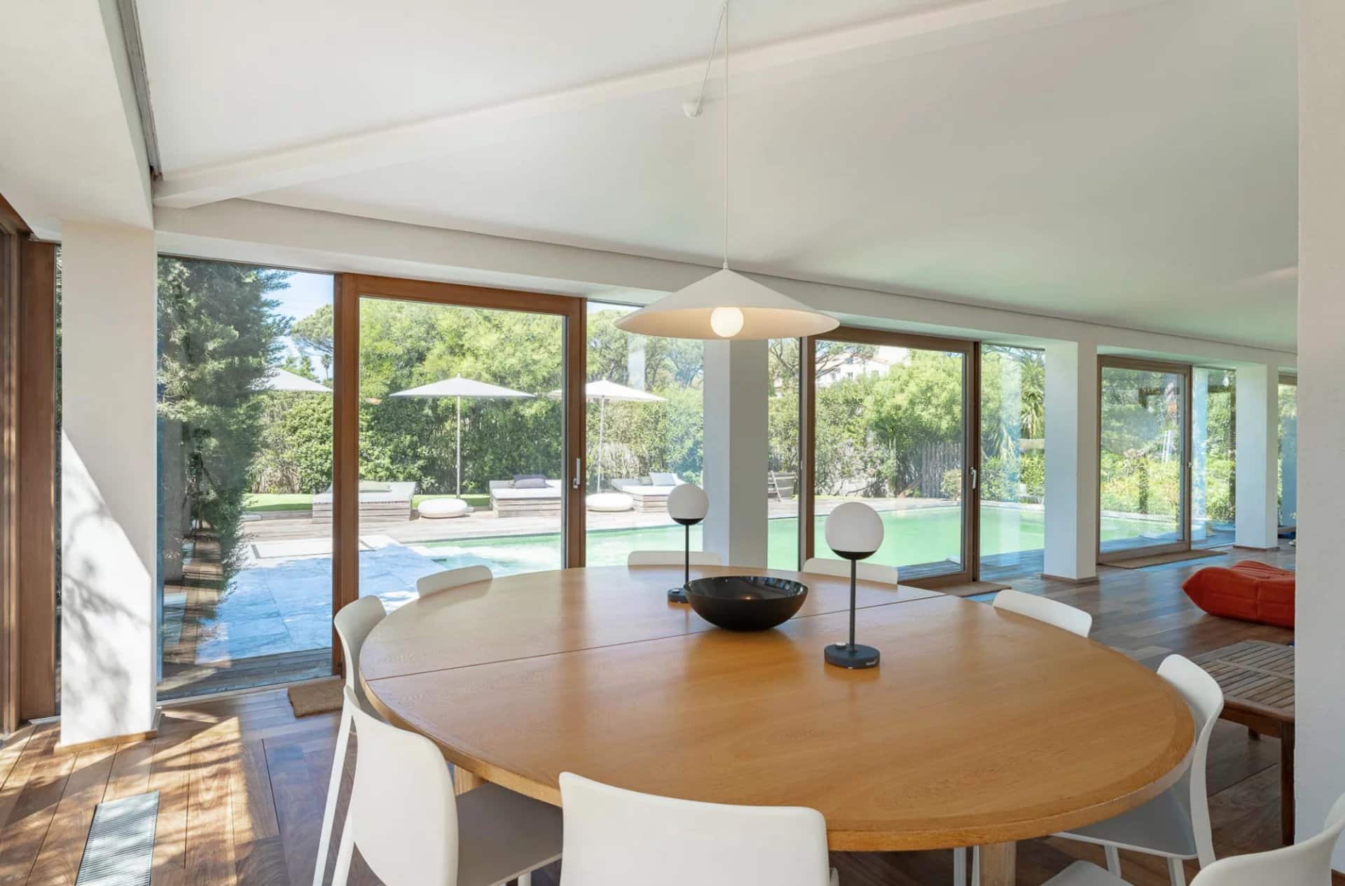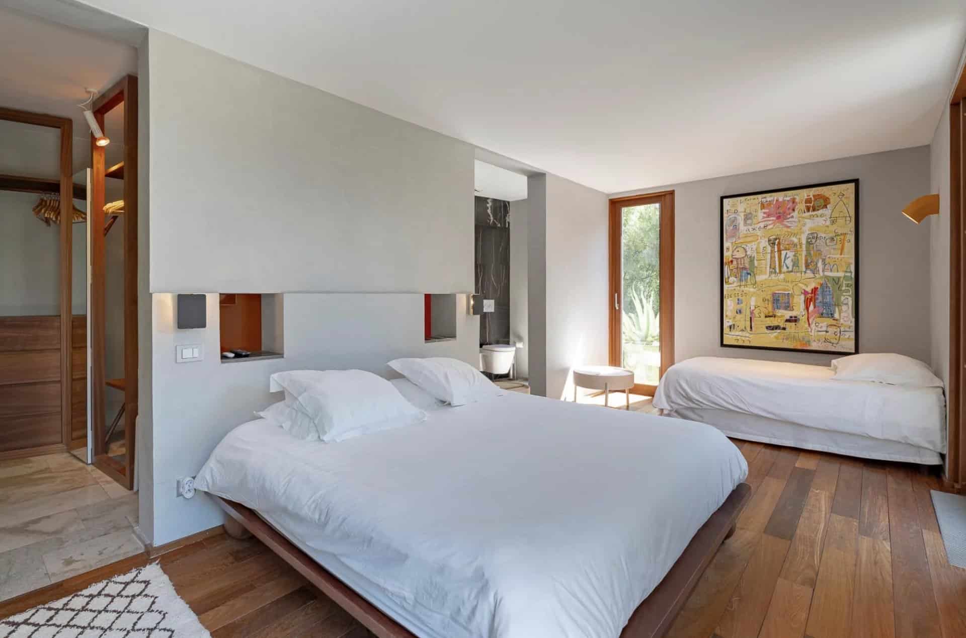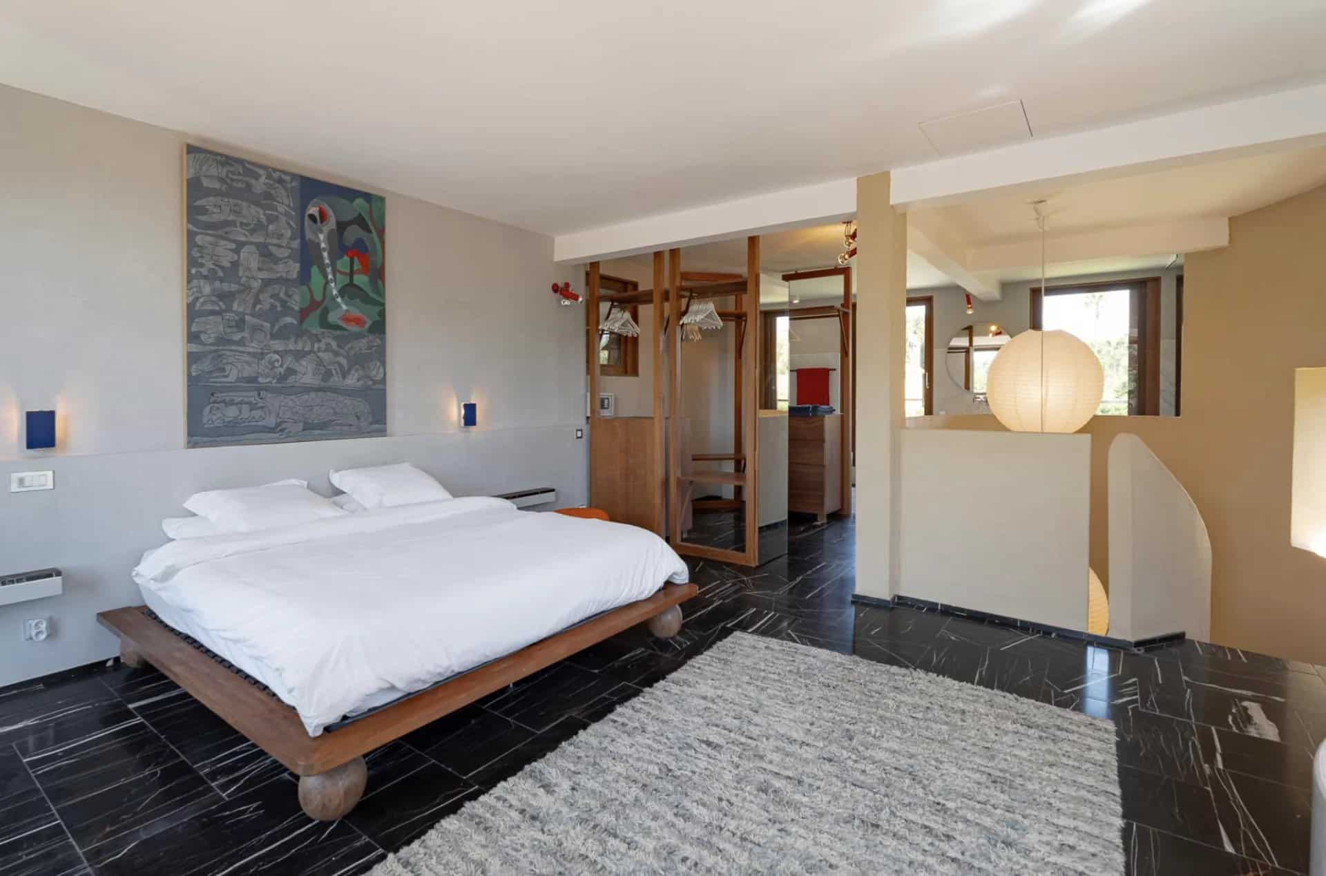 De belles oeuvres d'arts ornent les murs de la maison, des peintures ou des photos très contemporaines et de valeur.La piscine tout le long du salon donne l'impression que la maison est sur l'eau, le deck se prolonge à l'intérieur avec le parquet en bois. Toutes les chambres ont été pensées et étudiées pour être confortables, esthétiques et fonctionnelles : les dressings sont en bois légers et ouverts comme des sculptures, la literie est toute neuve et tous les lits sont des king-size. Les salles de bain sont en marbre avec des belles vasques rondes sur pied spécialement dessinées par l'architecte.