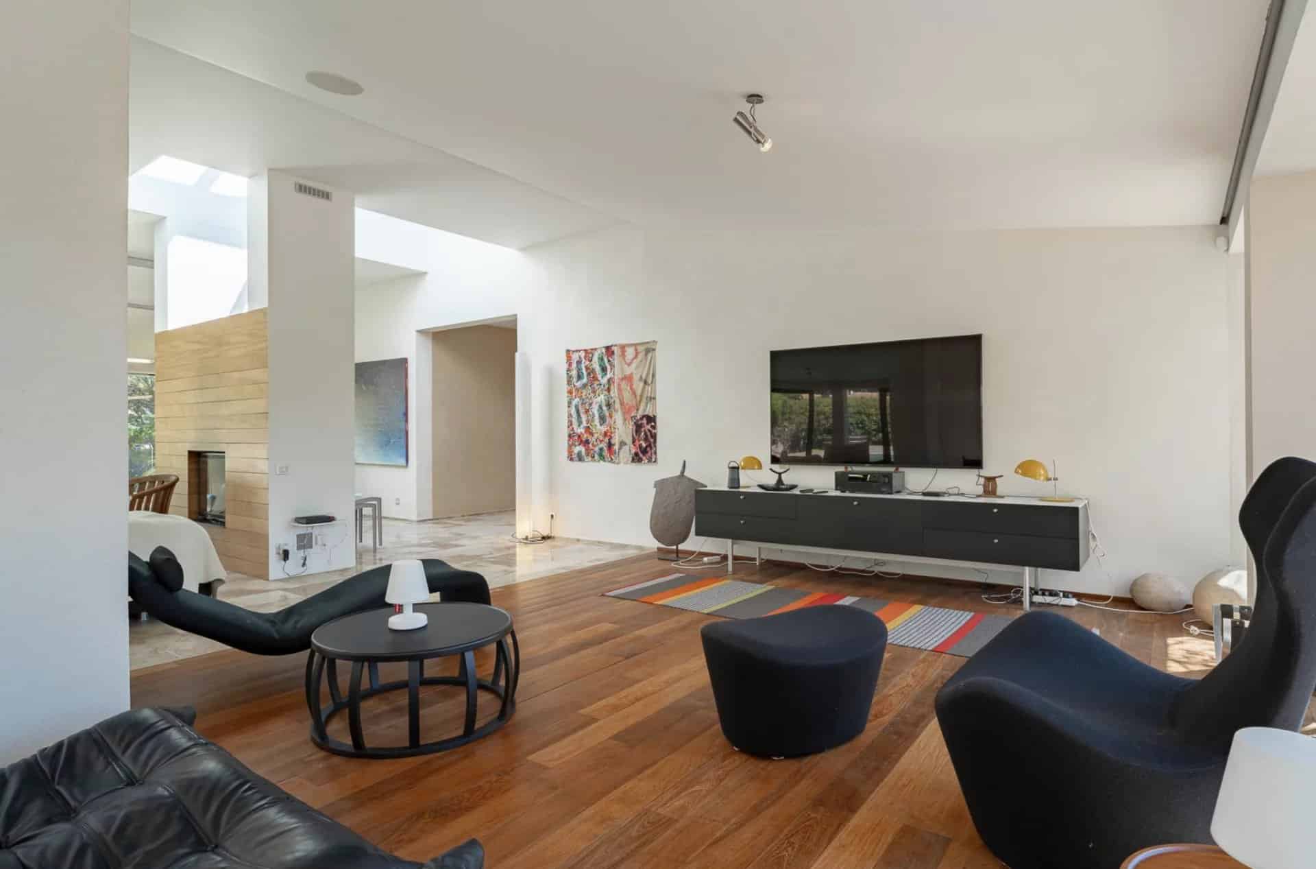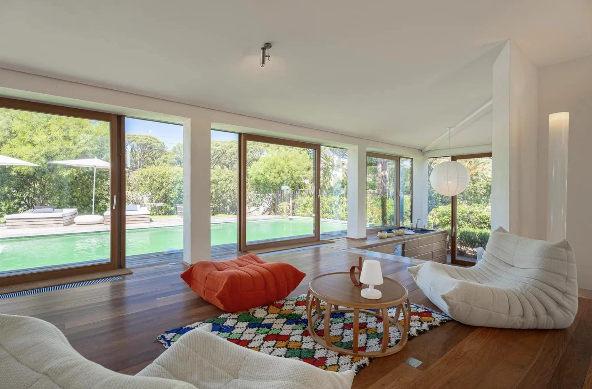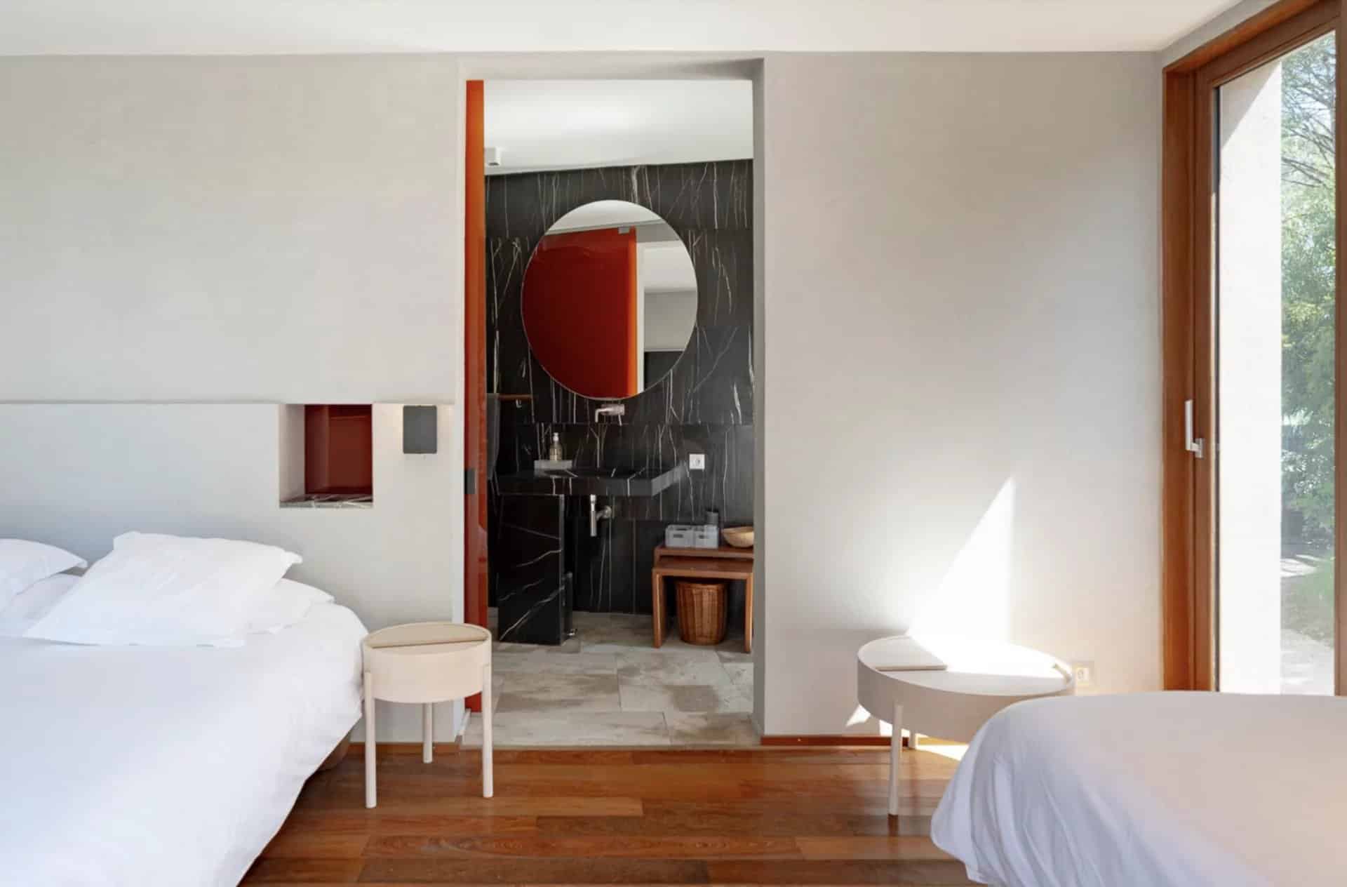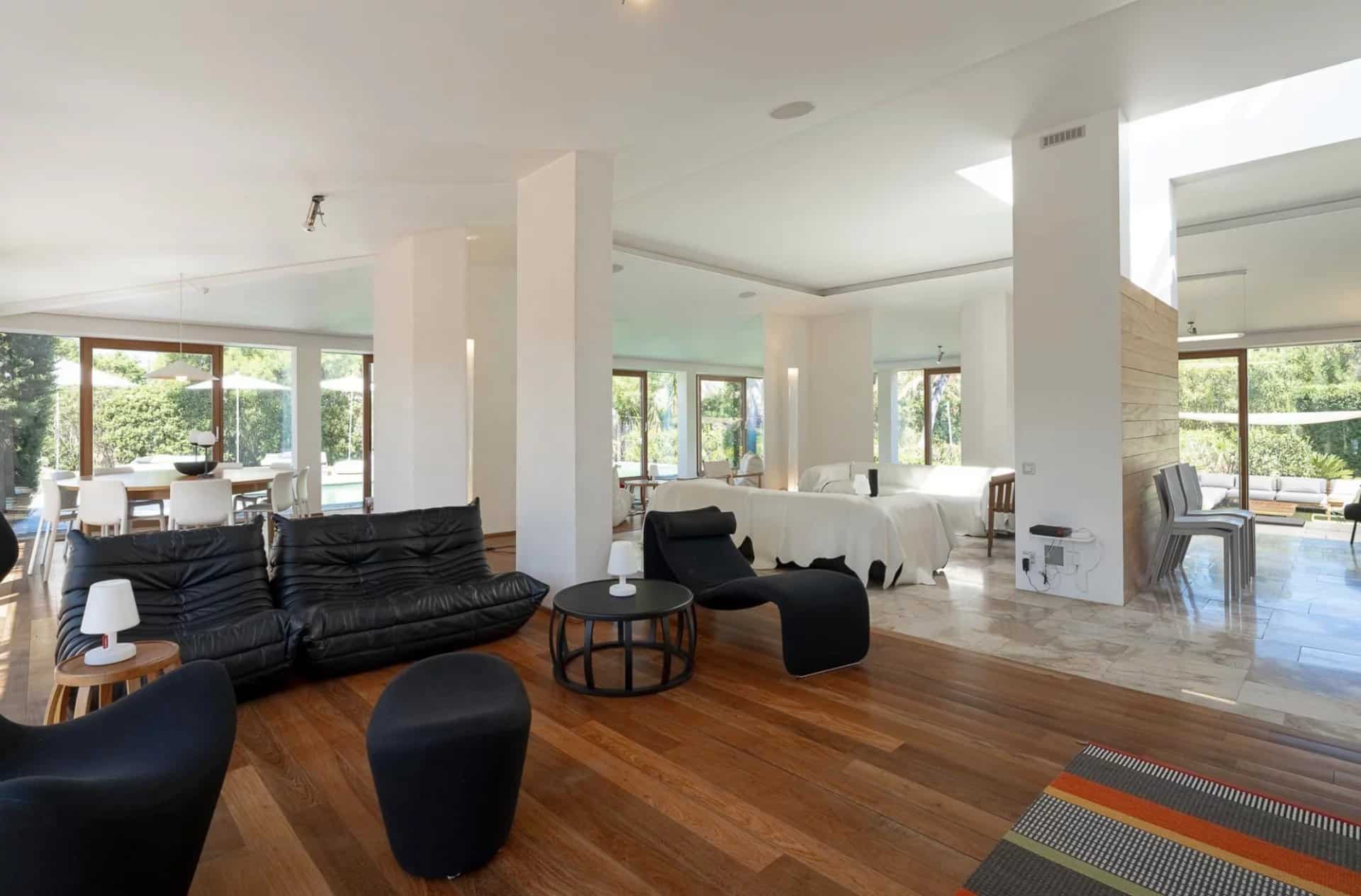 De belles oeuvres d'arts ornent les murs de la maison, des peintures ou des photos très contemporaines et de valeur.La piscine tout le long du salon donne l'impression que la maison est sur l'eau, le deck se prolonge à l'intérieur avec le parquet en bois. Toutes les chambres ont été pensées et étudiées pour être confortables, esthétiques et fonctionnelles : les dressings sont en bois légers et ouverts comme des sculptures, la literie est toute neuve et tous les lits sont des king-size. Les salles de bain sont en marbre avec des belles vasques rondes sur pied spécialement dessinées par l'architecte.