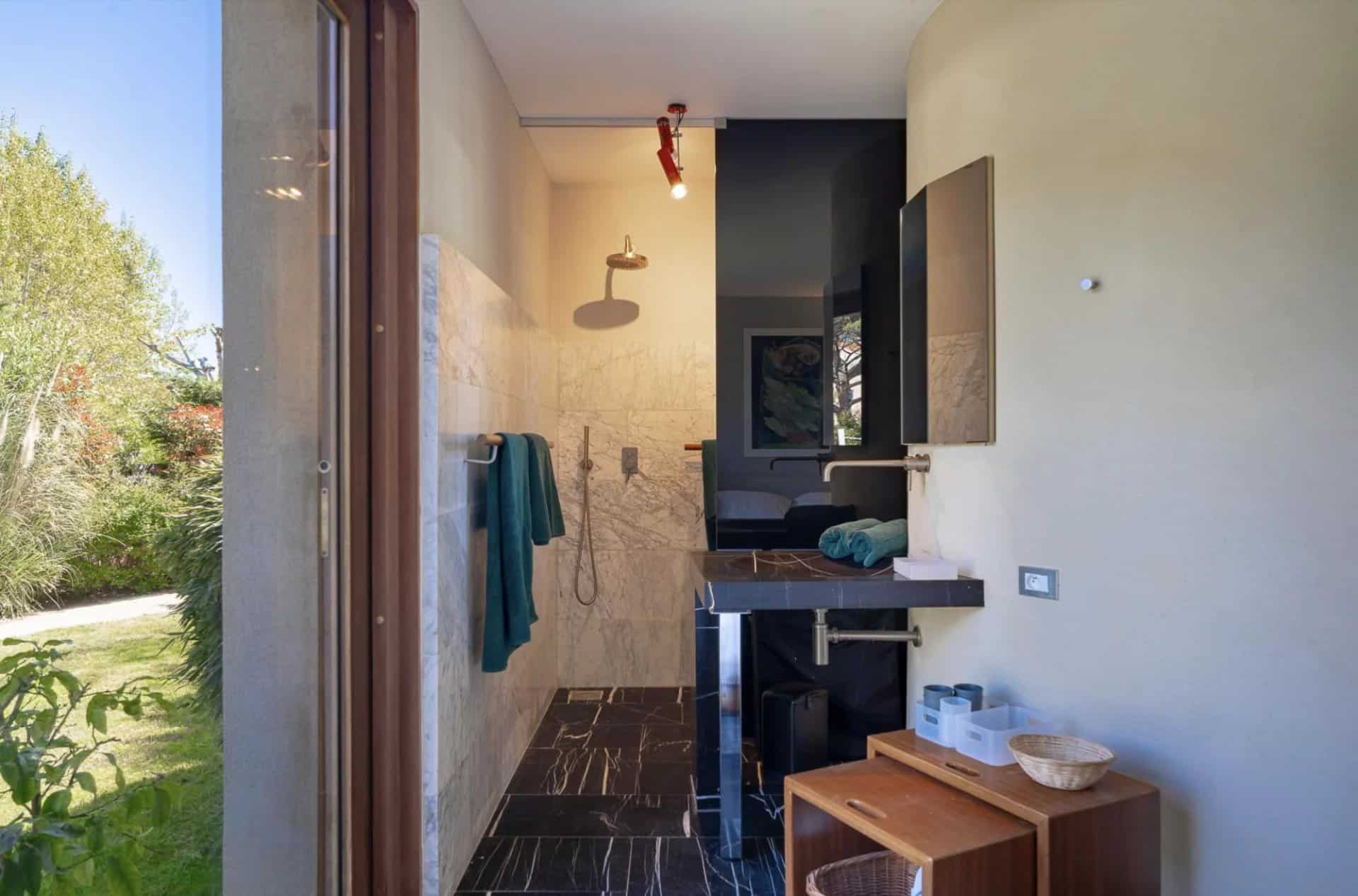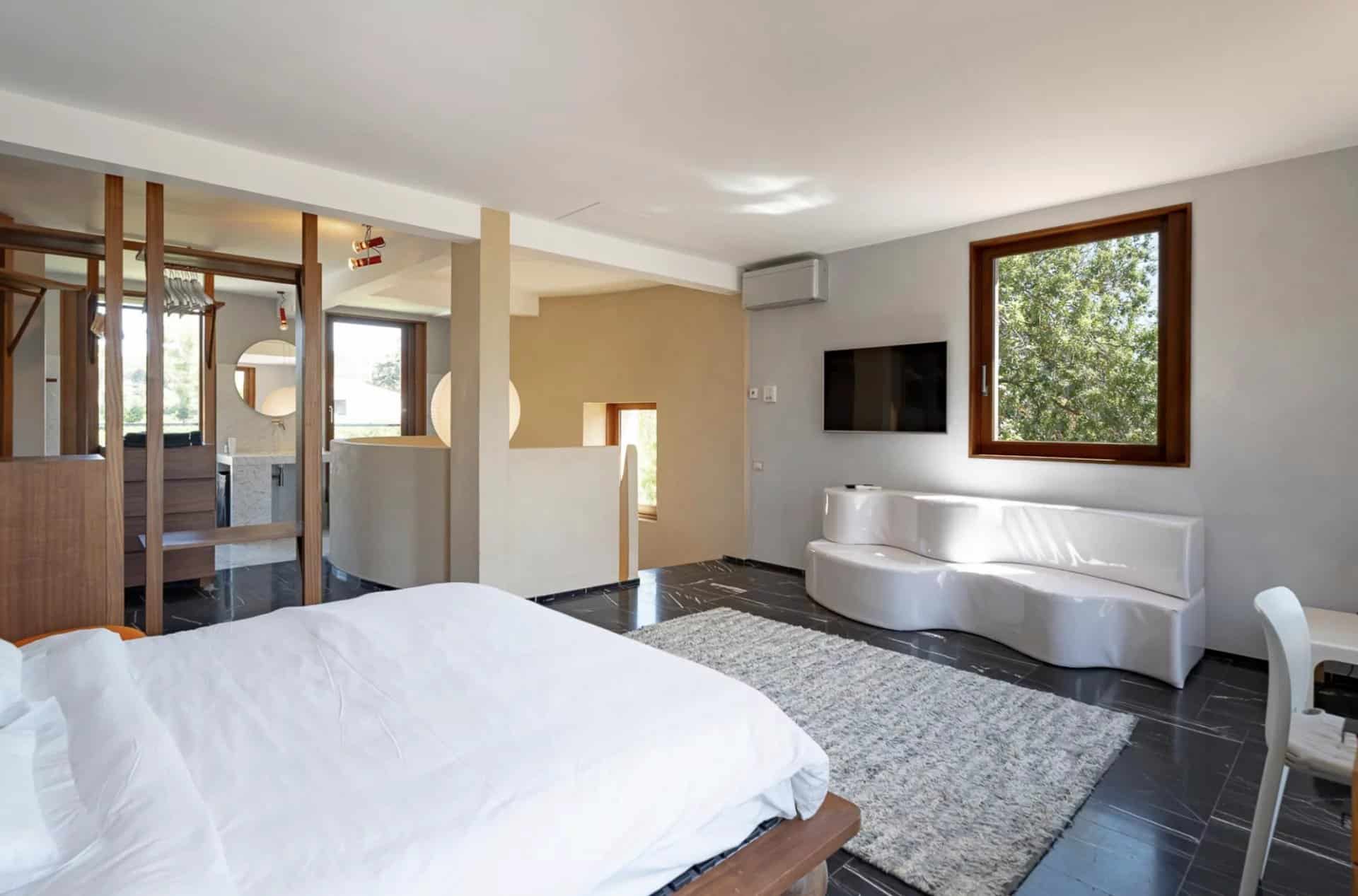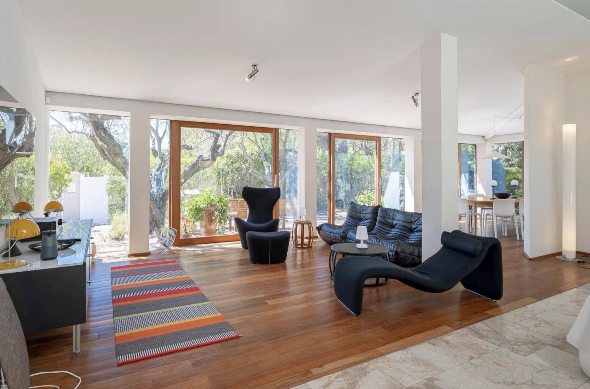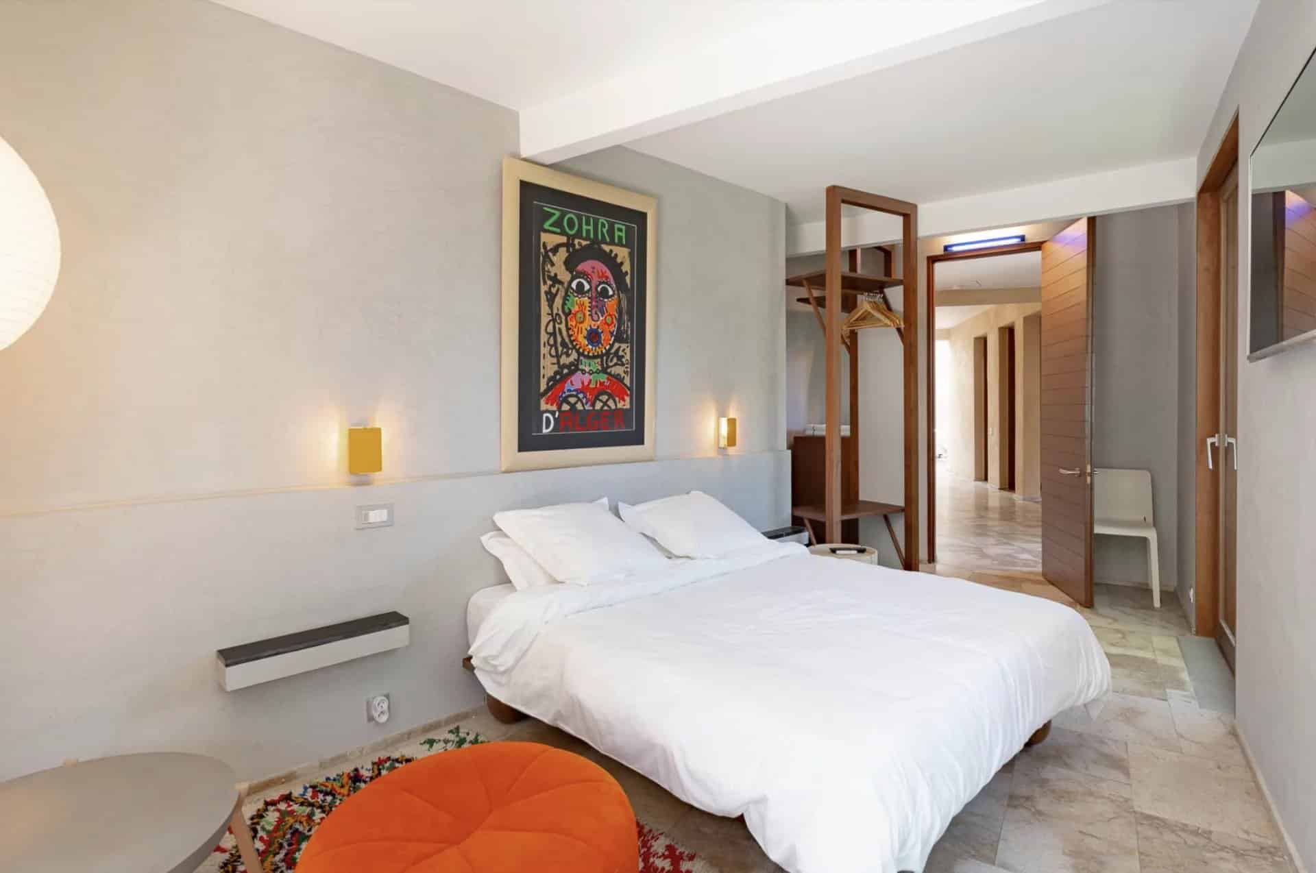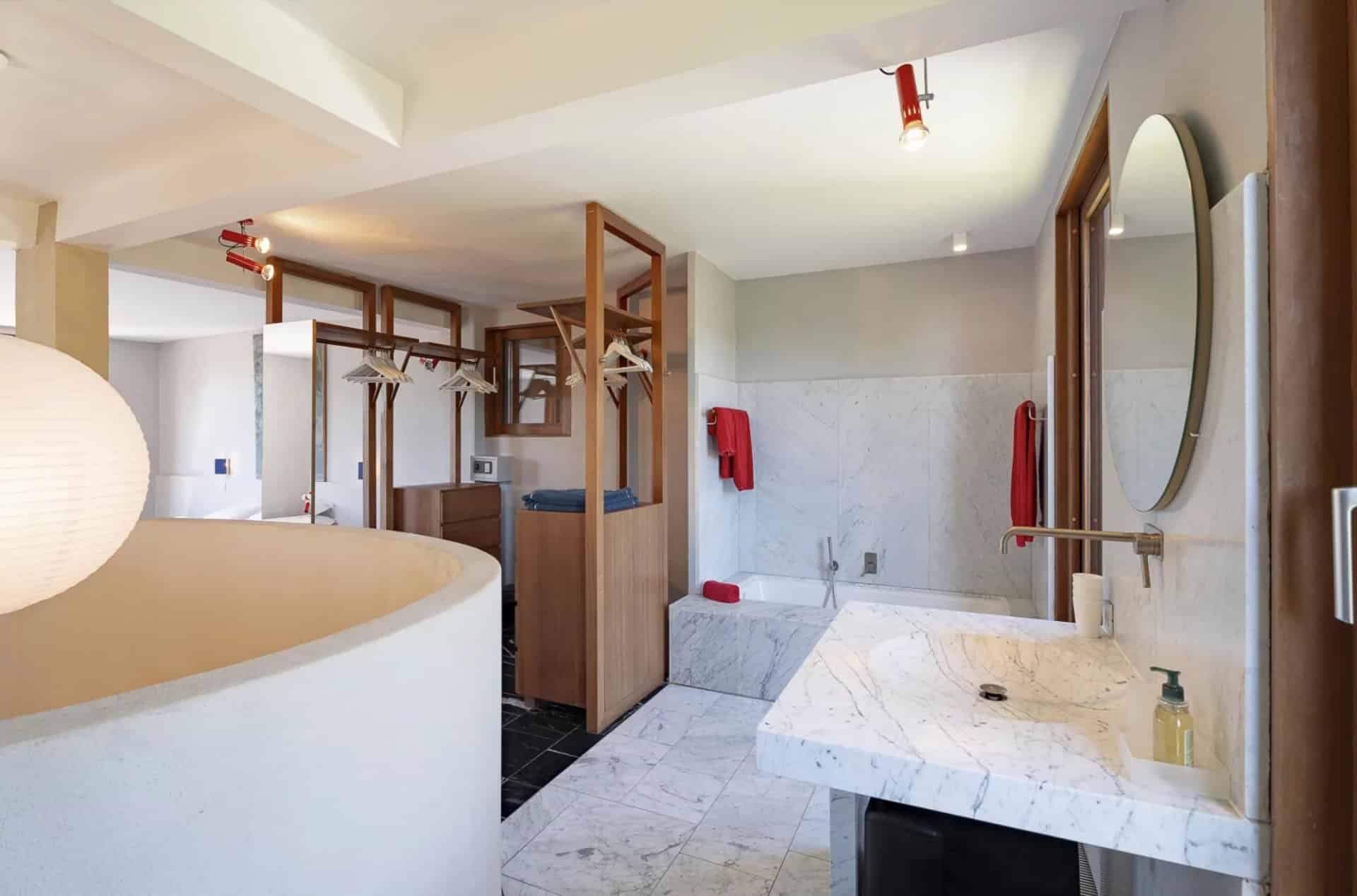 De belles oeuvres d'arts ornent les murs de la maison, des peintures ou des photos très contemporaines et de valeur.La piscine tout le long du salon donne l'impression que la maison est sur l'eau, le deck se prolonge à l'intérieur avec le parquet en bois. Toutes les chambres ont été pensées et étudiées pour être confortables, esthétiques et fonctionnelles : les dressings sont en bois légers et ouverts comme des sculptures, la literie est toute neuve et tous les lits sont des king-size. Les salles de bain sont en marbre avec des belles vasques rondes sur pied spécialement dessinées par l'architecte.