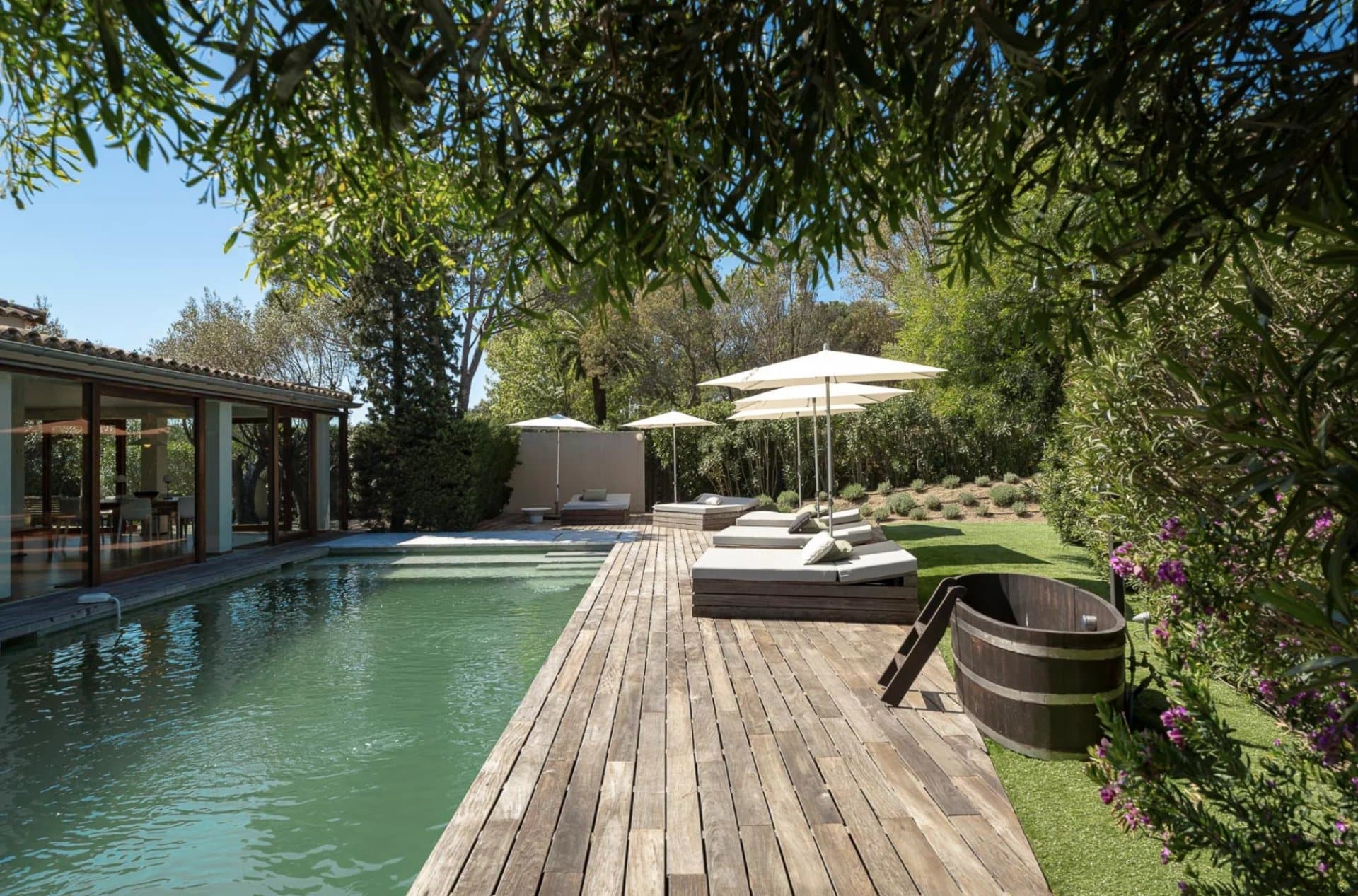 La propriété offre un joli jardin bien arboré, des terrasses aménagées pour profiter de moments de convivialités en famille et entre amis et des beds deux places tout autour de la piscine pour se prélasser.